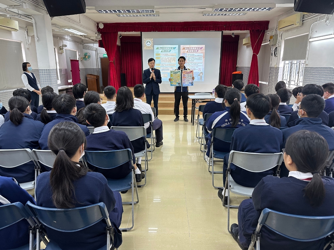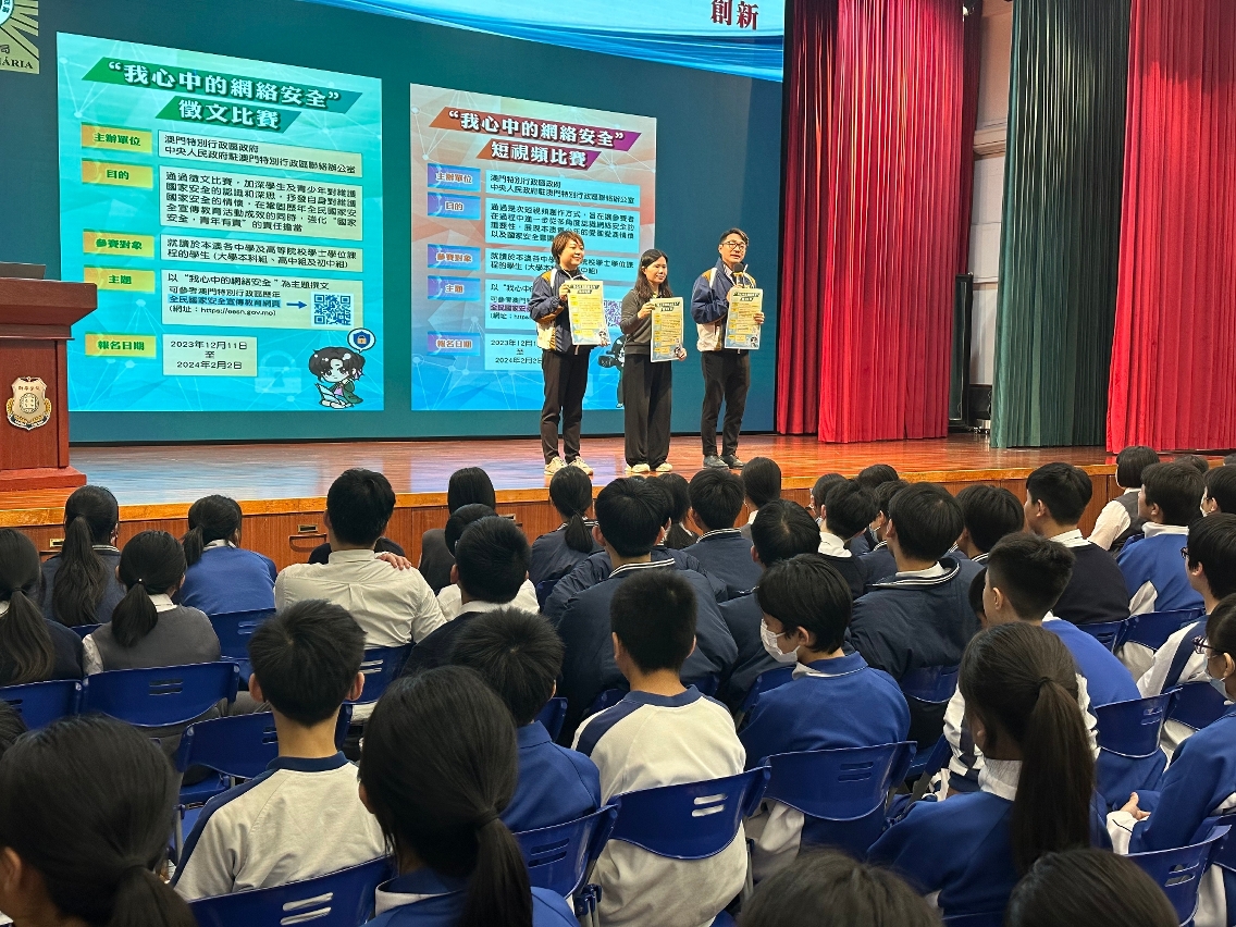 由澳门特别行政区政府、中央人民政府驻澳门特别行政区联络办公室联合举办的“我心中的网络安全”征文及短视频比赛现正接受报名,司法警察局自去年11月下旬开始持续派员走进校园开展相关宣传推广工作,鼓励学生踊跃参与。