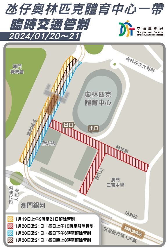 配合私人娱乐公司举办演唱会,1月19日(周五)至21日(周日)期间,氹仔奥林匹克体育中心-运动场周边将实施一系列临时交通措施。其中,配合警方在有需要时实施人流管制,“澳门运动场”站及“运动场/体育中心"站于1月20日(周六)上午10时起至21日(周日)临时停用;而“华宝花园”站、“美景花园”站、“运动场/赛马会”站及轻轨运动场站的行人天桥则于1月20日及21日每日晚上8时起临时停用,直至解除管制,期间,轻轨运动场站亦会实施暂不上落措施,乘客可使用其他周边巴士站搭乘相关路线,详情请参阅两巴网页(http://www.tcm.com.mo 及http://www.transmac.com.mo)。