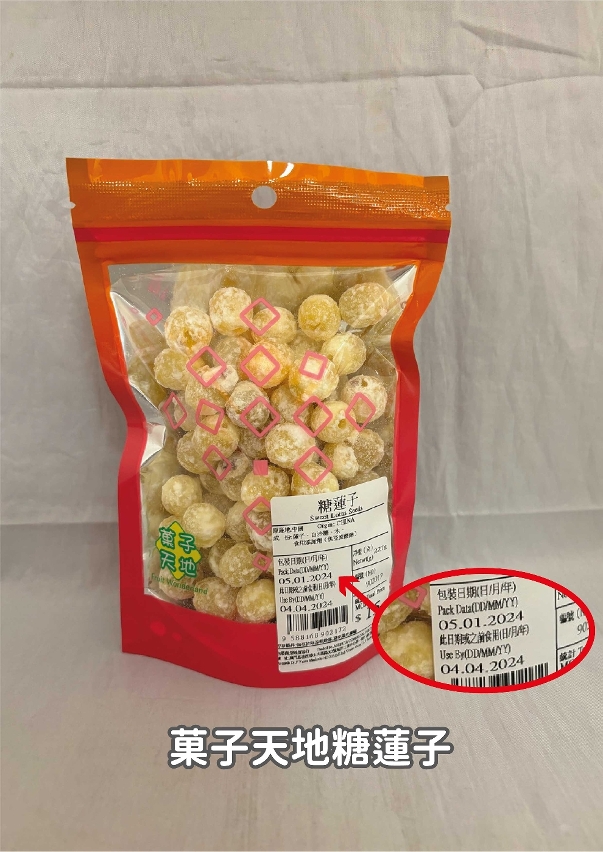 1. 预包装糖莲子,品牌为菓子天地,重量为227g/包,包装日期为 05.01.2024,此日期或之前食用为04.04.2024,检出二氧化硫含量为百万分之四百零八。