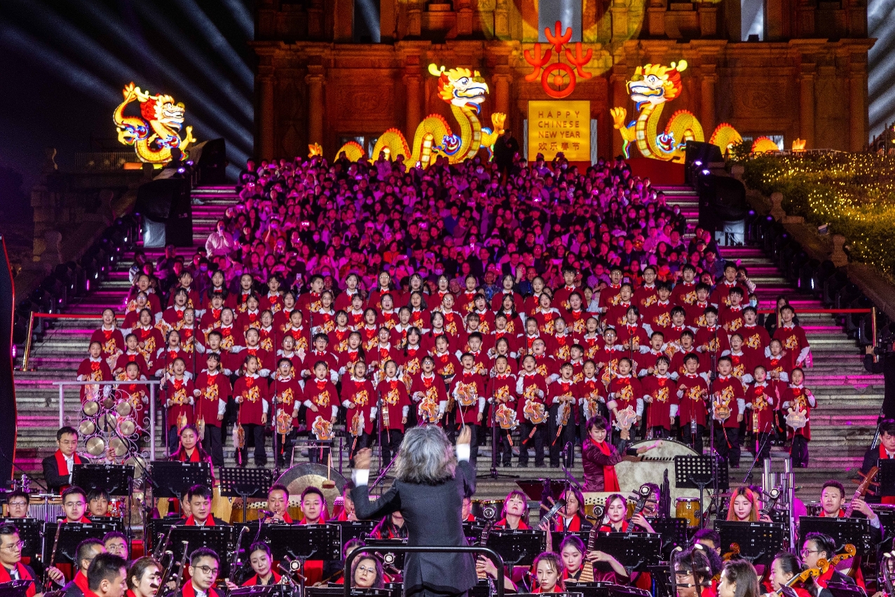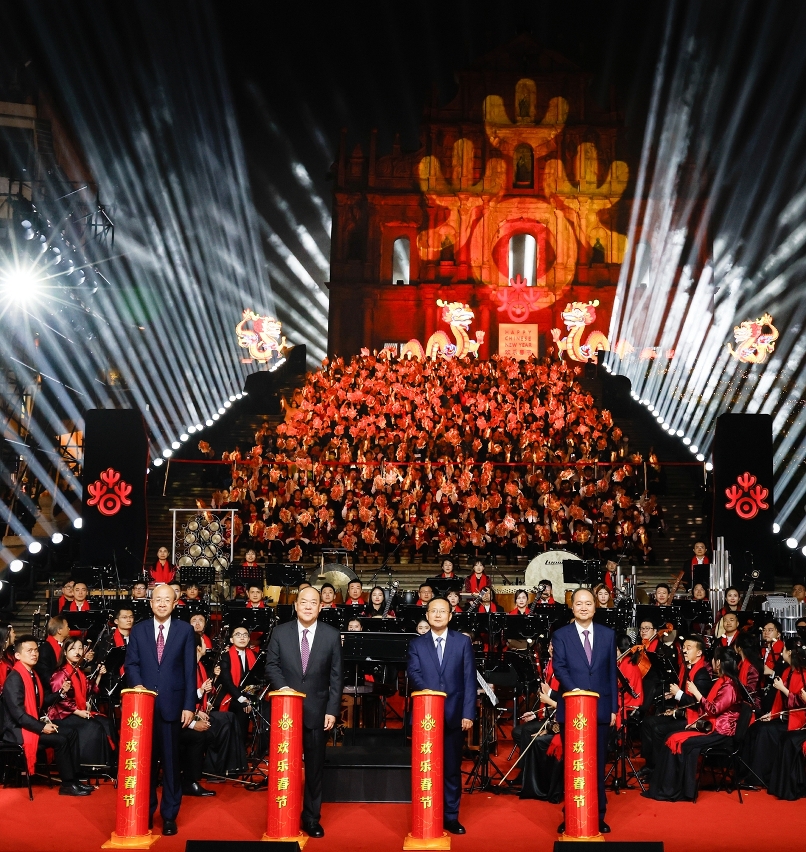 同场举行了“欢乐春节 春满濠江”音乐会,邀请到我国顶尖音乐家,包括斐声国际的作曲及指挥家谭盾、国家一级指挥彭家鹏及钢琴大师郎朗,携手澳门乐团第一小提琴首席后则周、澳门中乐团琵琶声部首席邓乐、敲击乐首席李畅,澳门中乐团、澳门少年合唱团、澳门罗梁体育总会等本澳艺文单位,在大三巴牌坊下呈献节日气氛浓厚的音乐作品,为全球民众送上新春祝福。节目将于新春期间在文化和旅游部的官方平台及合作渠道中播放,欢迎届时收看。