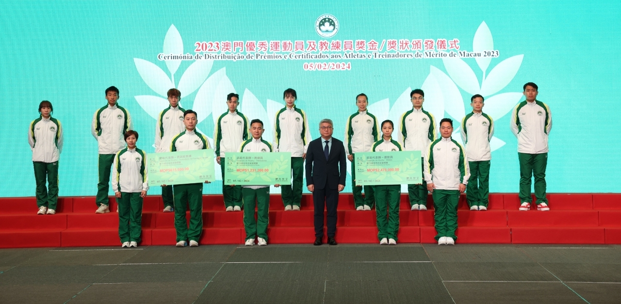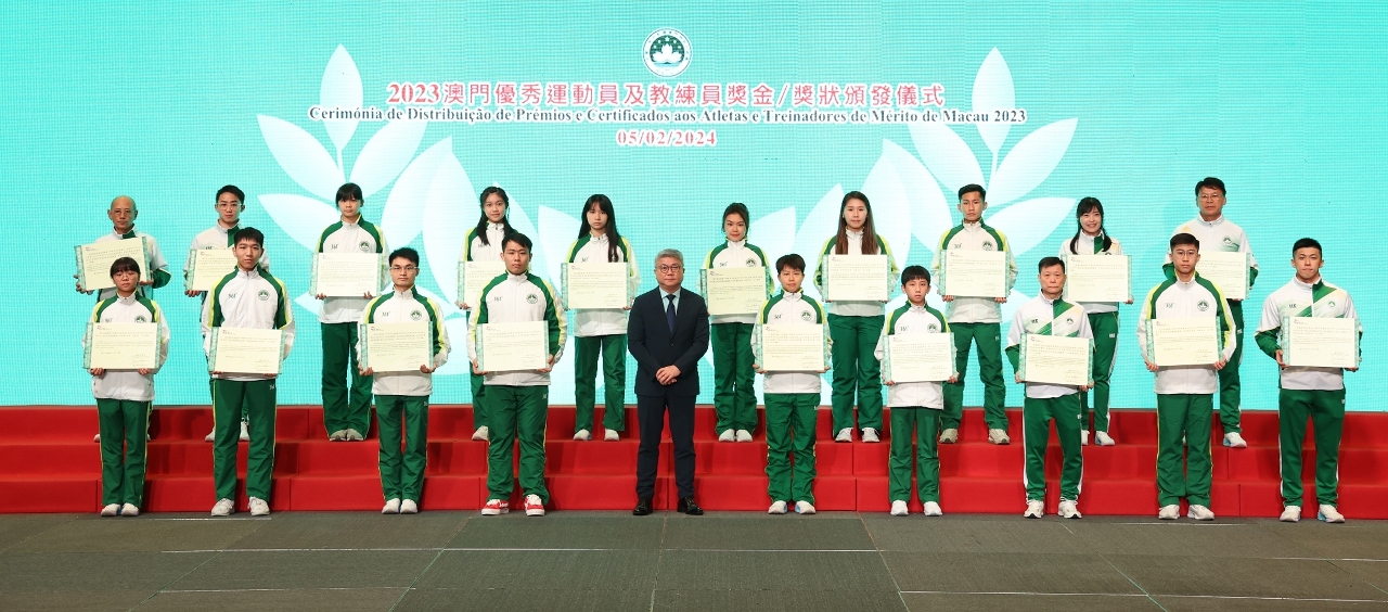 为表彰在2023年度参加体育比赛中获得优秀成绩的运动员及教练员,「2023澳门优秀运动员及教练员奖金/奖状颁发仪式」今(5)日晚上七时半举行,由澳门特别行政区政府社会文化司司长代表、社会文化司司长办公室主任何钰珊等出席了颁发仪式,并祝贺获奖的队伍。