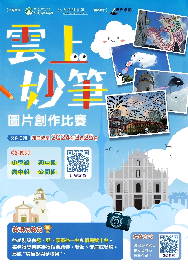 作为世界气象组织的地区成员,为庆祝3月23日“世界气象日”,以纪念于1950年生效的《世界气象组织公约》,地球物理气象局与澳门科学馆合办、澳门漫画从业员协会协办“云上妙笔图片创作比赛”,藉以提高公众对天气的关注和加深对云种等气象知识的瞭解。比赛由即日起至2024年3月25日接受报名,欢迎合资格人士踊跃参与。