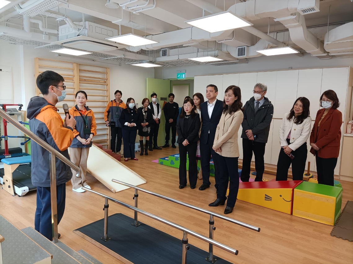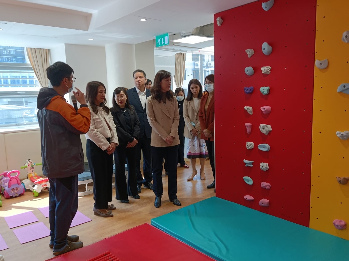 其后,欧阳瑜司长前往启智早期训练中心,参观中心内的暂托设施、早疗活动室、职业治疗室、物理治疗室、语言治疗室、幼儿洗手间、礼堂等。期间,听取了工作人员的介绍,该中心的环境设置和服务切合幼儿的成长发展需要,例如设有不同类型的幼儿洗手间设施;而早疗服务则针对特殊儿童的不同需要提供多元化的训练与治疗,如肌力训练、平衡力训练、言语治疗等,有助他们发挥潜能、融入社区生活;暂托活动室则可为有发展障碍特殊教育需要的儿童提供课后托管、周六托管、暑期托管和紧急托管服务。欧阳瑜司长特别感谢中心为幼儿提供了适切的治疗及训练,有助幼儿提升个人能力、愉快成长。