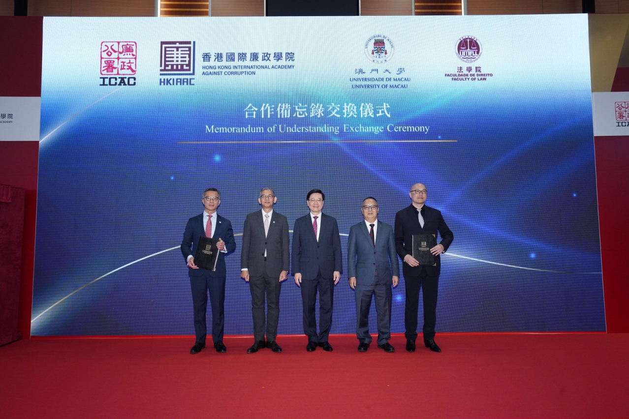 典礼上,香港国际廉政学院与内地、香港、澳门共五间知名大学签署合作备忘录,推动反贪研究和人才交流,包括北京大学政府管理学院、清华大学纪检监察研究院、澳门大学法学院、香港大学社会学系及香港科技大学公共政策学部。廉政学院将与合作大学加强经验分享和数据交流,以及在反贪人才培训方面加强协作。在李家超、胡英明和宋永华的见证下,丘树春与澳大法学院院长唐晓晴交换合作备忘录。