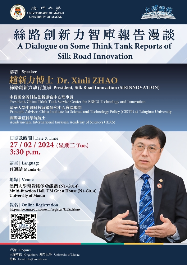 澳门大学将于2月27日(星期二)举办“大学讲坛”,邀请丝路创新力执行董事、国际欧亚科学院院士赵新力以“丝路创新力智库报告漫谈”为题发表演说,对 “一带一路”的发展进行分析、评价和展望。欢迎有兴趣人士参加。