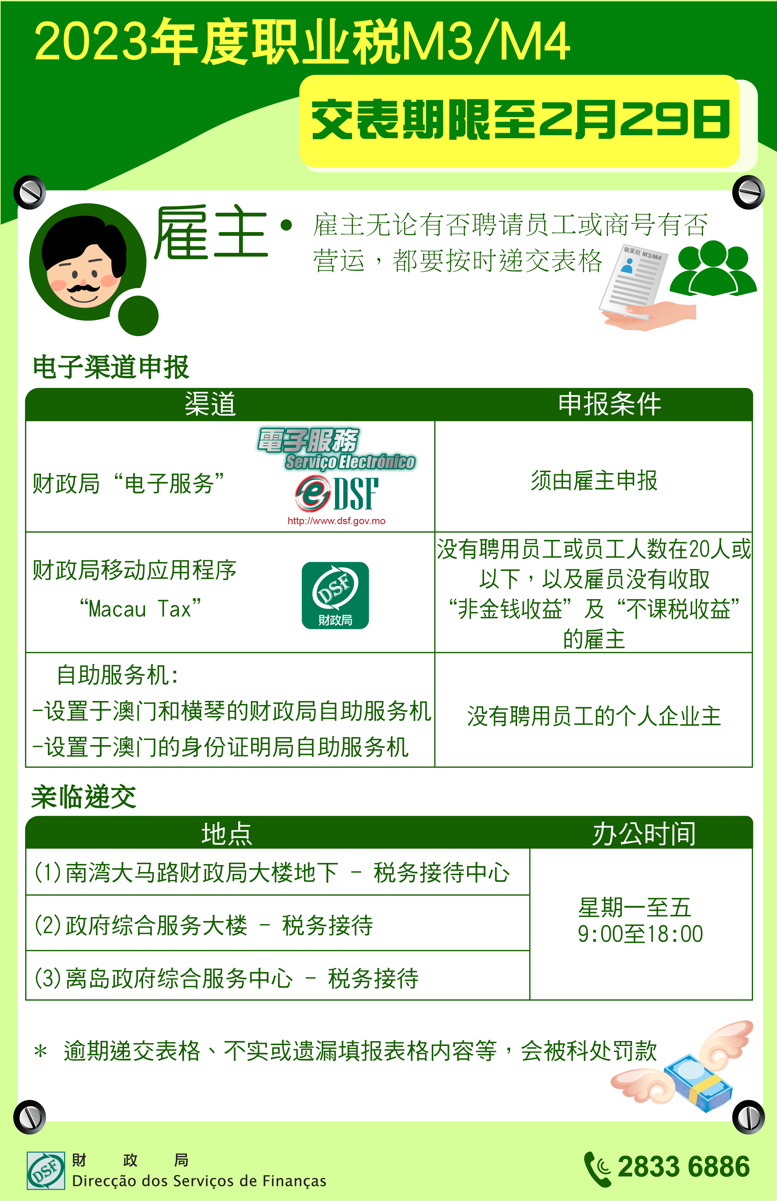 2023年度职业税第一组M3/M4格式(雇员或散工名表)递交期限至2月29日,雇主无论有否聘请员工或商号有否营运,均须于上述法定期限内递交有关表格,逾期递交表格、不实或遗漏填报表格内容等都属行政违法,会被科处罚款。