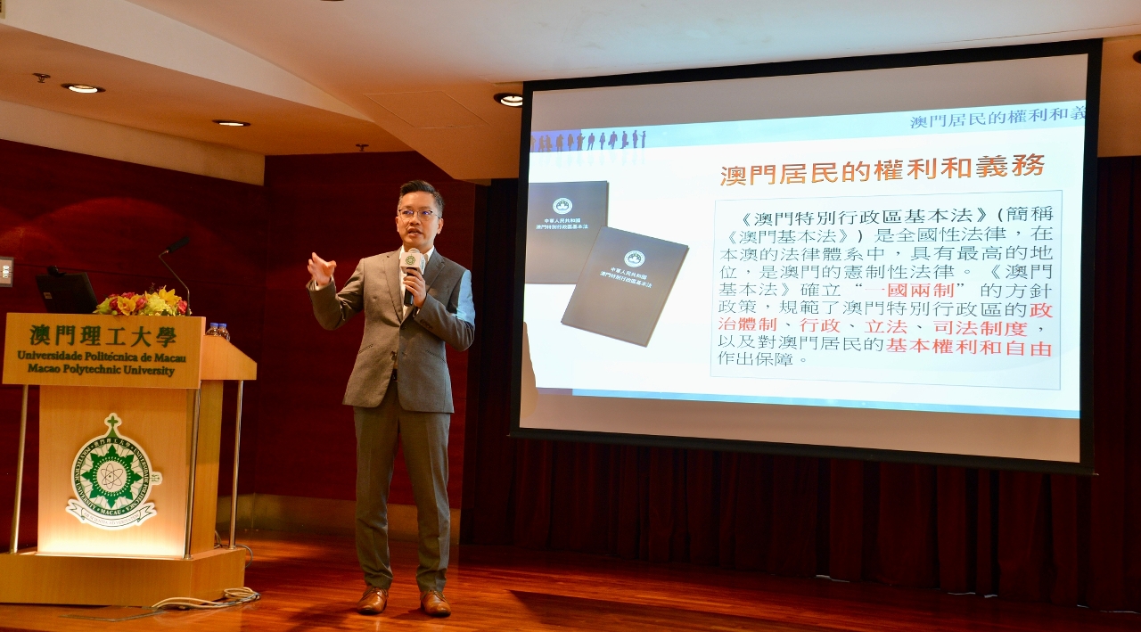 为加强大学生对《澳门基本法》、国籍法、以及领事保护服务的认识,澳门理工大学学生事务处于2月21日举办“《基本法》澳门居民的权利和义务、国籍法、以及领事保护与协助”讲座,邀请中华人民共和国外交部驻澳门特别行政区特派员公署领事部二秘林珑及澳门特区政府身份证明局居民身份资料厅厅长刘天德主讲。澳理大语言及翻译学院代院长张云峰、学生事务处处长刘颖欣及近百名师生出席。