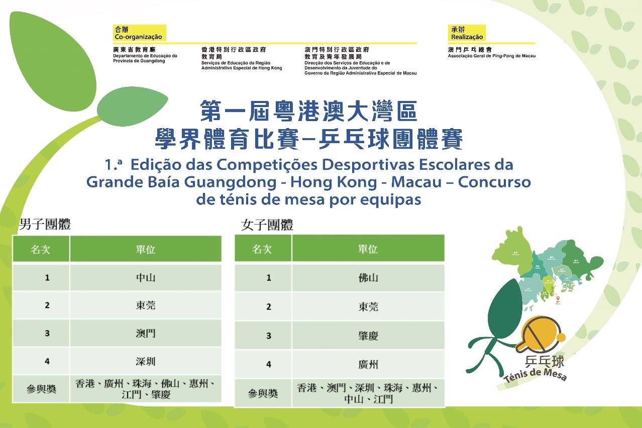 由广东省教育厅、香港特别行政区政府教育局和澳门特别行政区政府教育及青年发展局合办,澳门乒乓总会承办的“第一届粤港澳大湾区学界体育比赛─乒乓球团体比赛”已于2024年3月2日至6日一连五天在澳门顺利举行,分别由中山市和佛山市夺得男子组和女子组团体冠军,澳门学界乒乓球代表队夺得男子组团体季军。