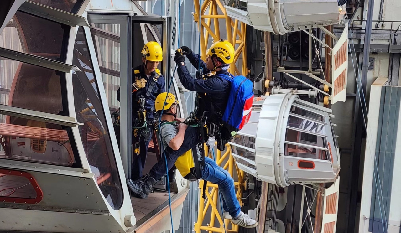 消防局接报后,立即派遣5架紧急车辆及17名队员赶赴现场,消防局高空拯救队员联同新濠影汇绳索救援人员,按既定计划开展高空拯救行动,将两名分别不适及受伤乘客带返安全位置,经进行护理后模拟送院治理,而其余乘客在摩天轮救生吊船恢复运作后安排离开。
