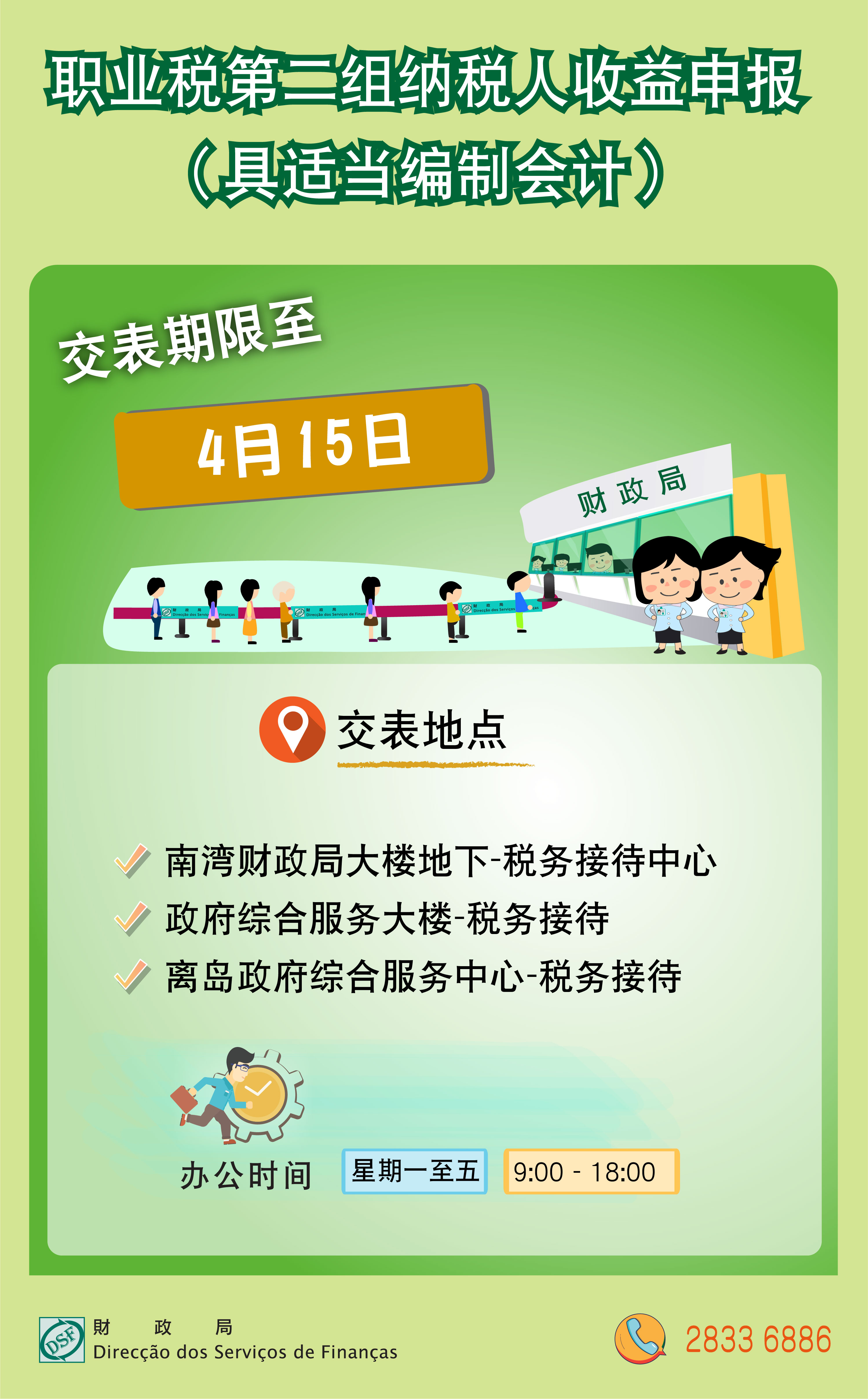 财政局呼吁仍未递交上述申报书之纳税人,尽快于限期前前往下列地点递交(办公时间星期一至五:上午九时至下午六时):