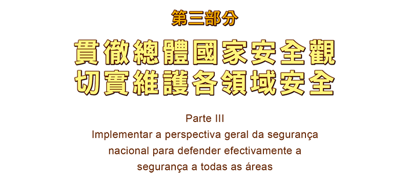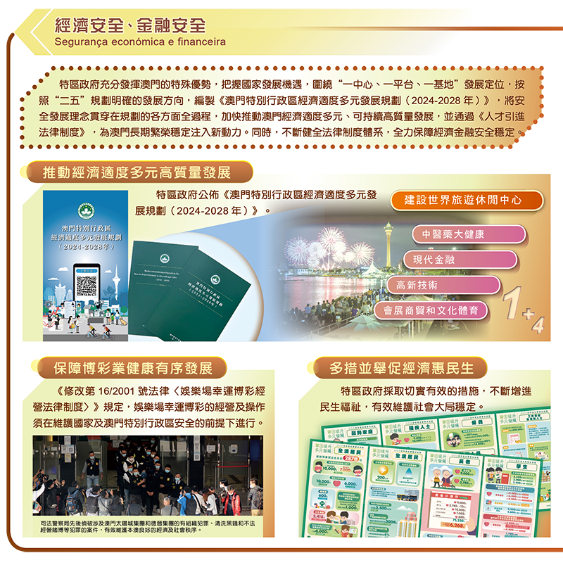 该部份特别展示了澳门特区持续健全维护国家安全的法律制度,在政治、经济、社会、文化等安全领域出台了一系列法律法规,尤其2023年完成修改《维护国家安全法》,为更好维护国家主权、安全、发展利益,确保澳门长期繁荣稳定发展提供了更为坚实的制度保障。