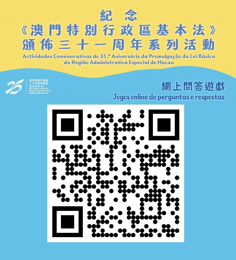 为纪念《澳门特别行政区基本法》颁布三十一周年,澳门基本法推广协会、法务局、市政署和教育及青年发展局将于5月13日至26日合办网上问答游戏,欢迎年满七岁的澳门居民参加。