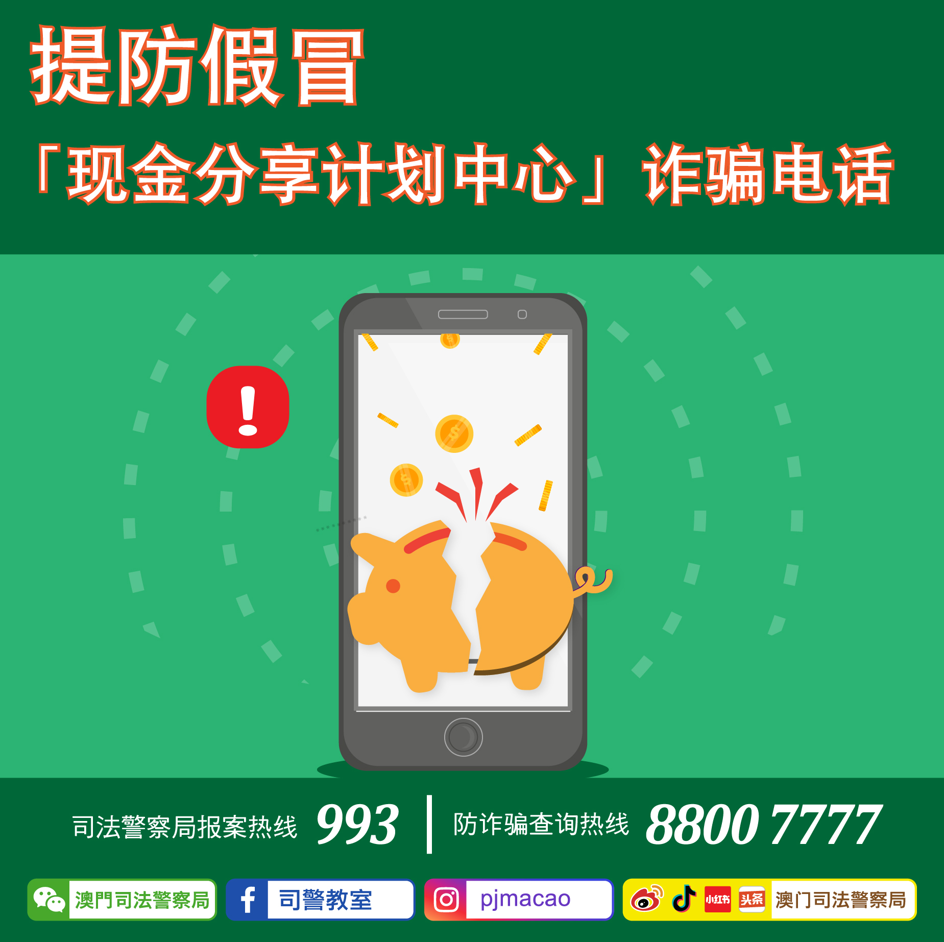 司警局反诈骗协调中心提醒广大市民,不明来电应果断拒绝并立即挂线,切勿轻信任何自称官方机构的来电,若有怀疑,应循官方途径查询核实。如接获任何怀疑诈骗电话,可使用司警局“反诈程式”查询风险指数或上报资料,又或致电司警局防诈骗查询热线88007777及报案热线993求助。