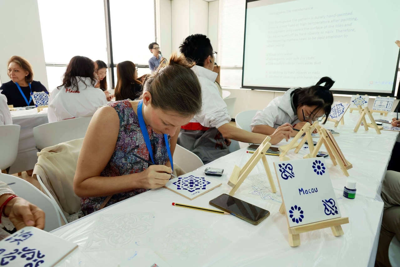 与会者昨日(17日)下午参与两项有关澳门中西文化遗产的学习体验,包括炮制葡挞及土生葡人曲奇虫仔饼工作坊,以及绘画葡萄牙蓝彩瓷砖工作坊,教授参加者亲手绘制可在澳门多座教堂及历史建筑内找到的瓷砖画艺术。