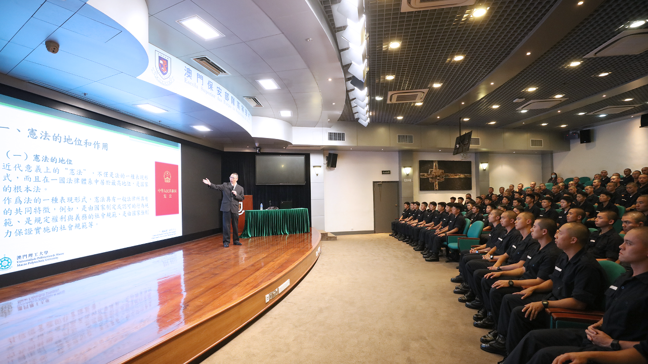 法务局与澳门保安部队高等学校于5月24日合办“高等院校《宪法》与《基本法》专题系列活动”,邀请了澳门理工大学“一国两制”研究中心主任冷铁勋担任讲座主讲,共148名澳门保安学员参与。