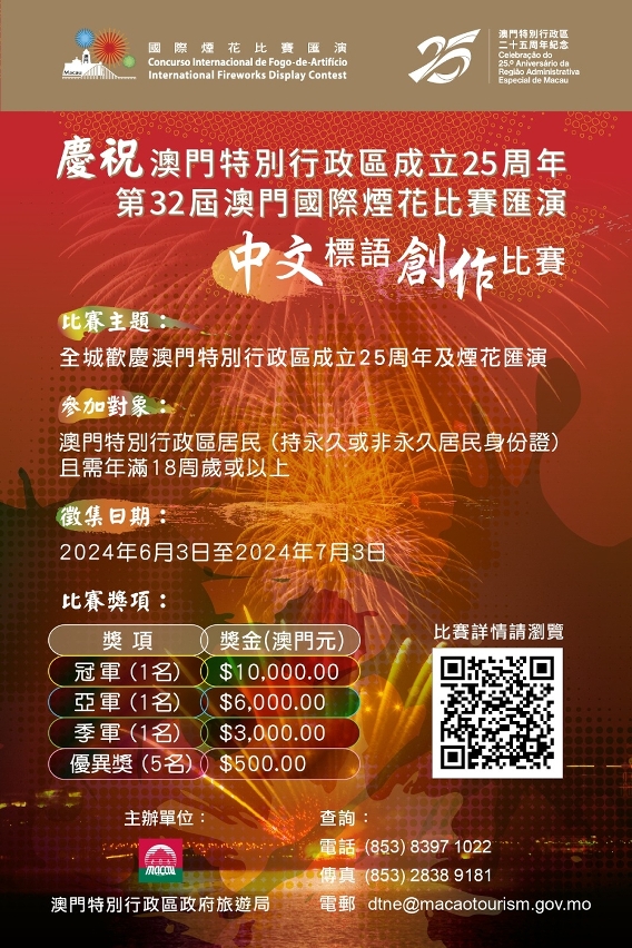 “庆祝澳门特别行政区成立25周年 第32届澳门国际烟花比赛汇演中文标语创作比赛”章程可扫描海报二维码或浏览网站:https://ep.macaotourism.gov.mo/contest-fireworks-slogan-2024/?lang=zh-hant。如有任何问题或查询,请于办公时间内致电(853) 8397 1022、传真(853) 2838 9181,或发送电子邮件至dtne@macaotourism.gov.mo。