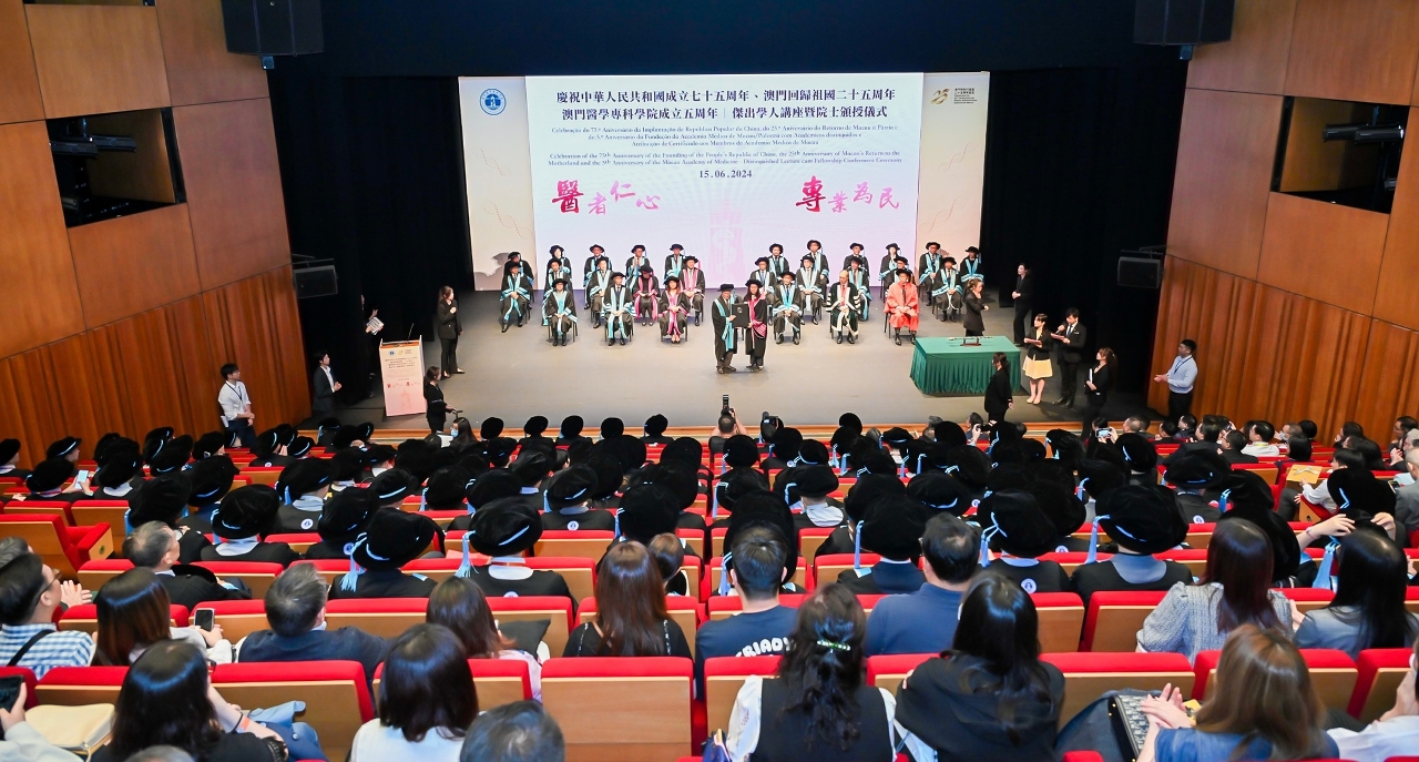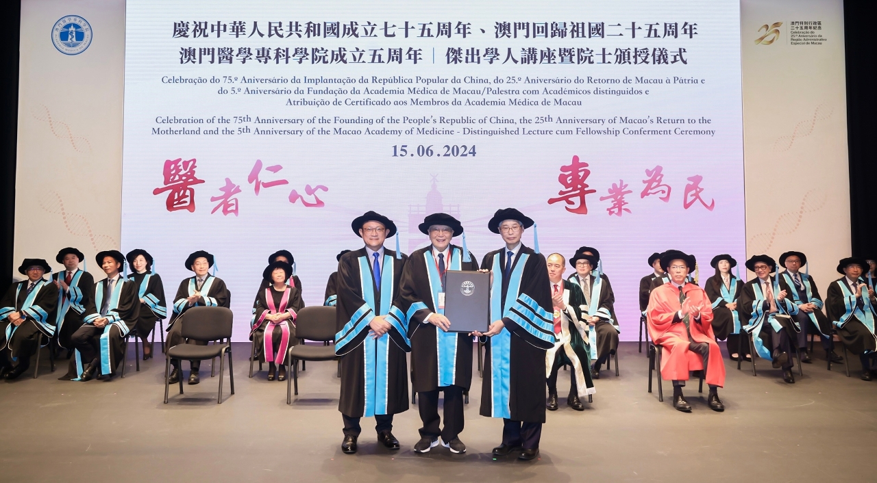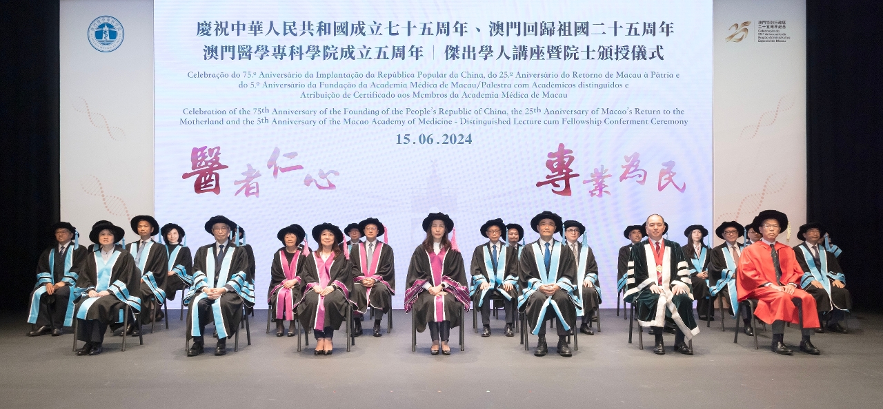为庆祝中华人民共和国成立75周年、澳门回归祖国25周年、澳门医学专科学院成立5周年,卫生局辖下澳门医学专科学院昨(15)日,假澳门文化中心举行杰出学人讲座暨2024年度院士颁授仪式。仪式由社会文化司欧阳瑜司长、社会文化司司长办公室何钰珊主任、卫生局罗奕龙局长、香港医学专科学院梁嘉杰主席、香港大学李嘉诚医学院刘泽星院长、澳门医学专科学院专业委员会熊志添主席共同主礼。此外,还有20多位来自内地及香港的嘉宾、本澳医疗机构代表及澳门医学专科学院架构成员等出席了是次典礼。