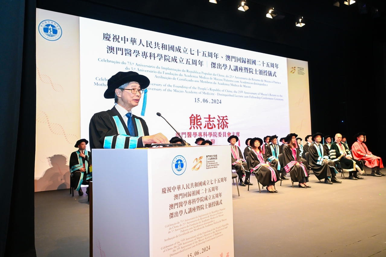 熊志添主席致辞时勉励获颁授院士,指出在人工智能及其应用助推下,医学科学以惊人速度不断向前发展,寄语院士应以最前沿的医学科学知识及先进医学技术来武装和充实自我,以应对未来各种挑战。他又强调,学院自成立以来得到特区政府大力支持,过去5年在全体架构成员及一众院士的齐心协力下,完成多项重要任务,包括建立统一本澳公共和私人领域医学专科培训的制度及计划、推动本澳设立专科医生资格认可制度及专科培训单位认证制度,并顺利完成学院第一个延续医学教育/持续专业发展(CME/CPD)周期;与此同时,重新出版《澳门医学杂志》,持续对外开展专科医疗交流合作等,各项工作成果为提升澳门专科医生培训质量、促进澳门专科医生专业发展提供了新的、广阔的发展空间。