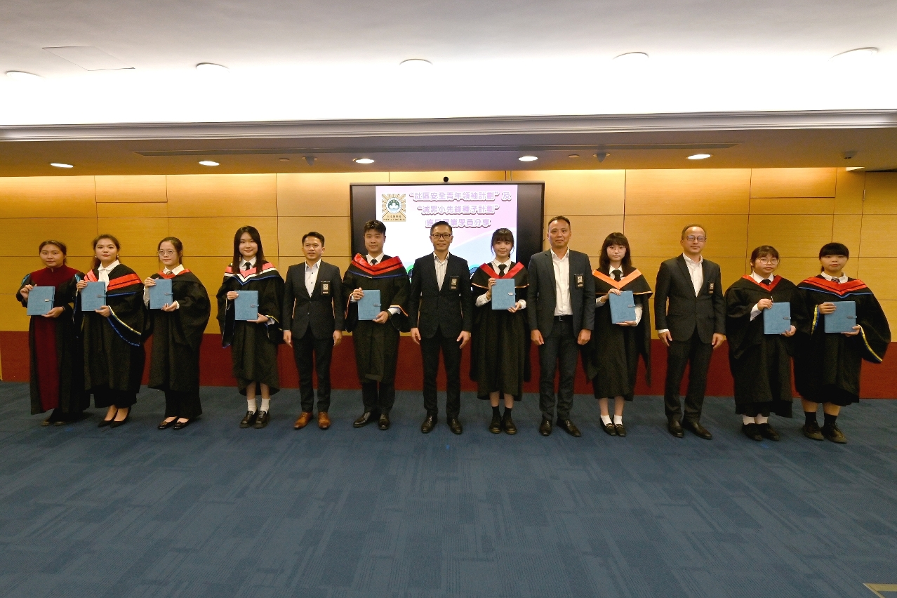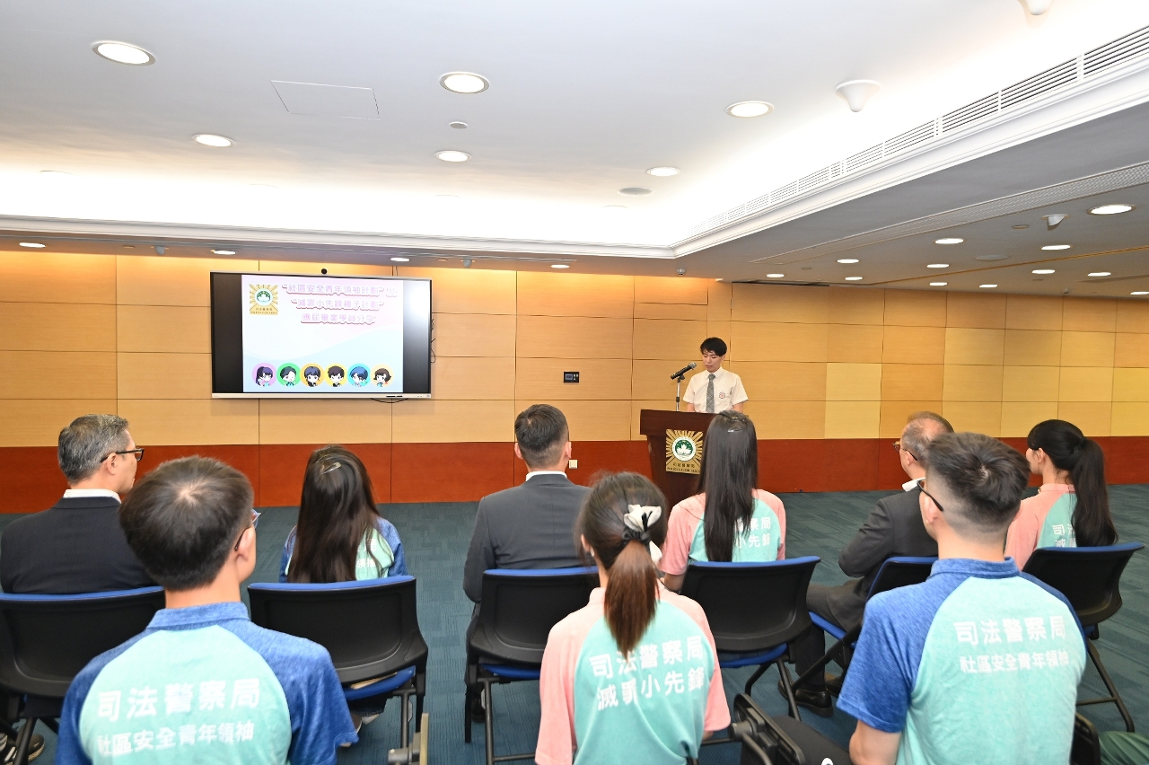 司法警察局为“社区安全青年领袖计划”及“灭罪小先锋种子计划”应届大学及中学毕业学员举办欢送会,司警局局长薛仲明勉励学员继续发扬社区安全青年领袖和灭罪小先锋的精神,协助警方在校园和社会传播警民合作、防罪守法的讯息,并带动更多同辈关心和服务社会,担当起澳门青年的责任和使命,共同为国家和澳门的发展作出有力承担。