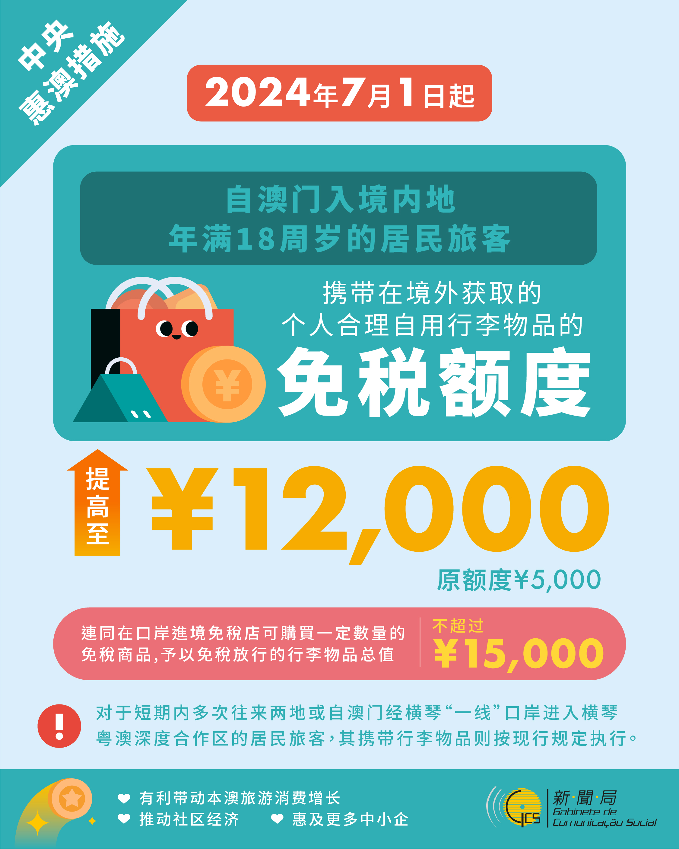 【图文包】中央惠澳措施 - 提高自澳门入境内地的居民旅客携带自用行李物品之免税额度