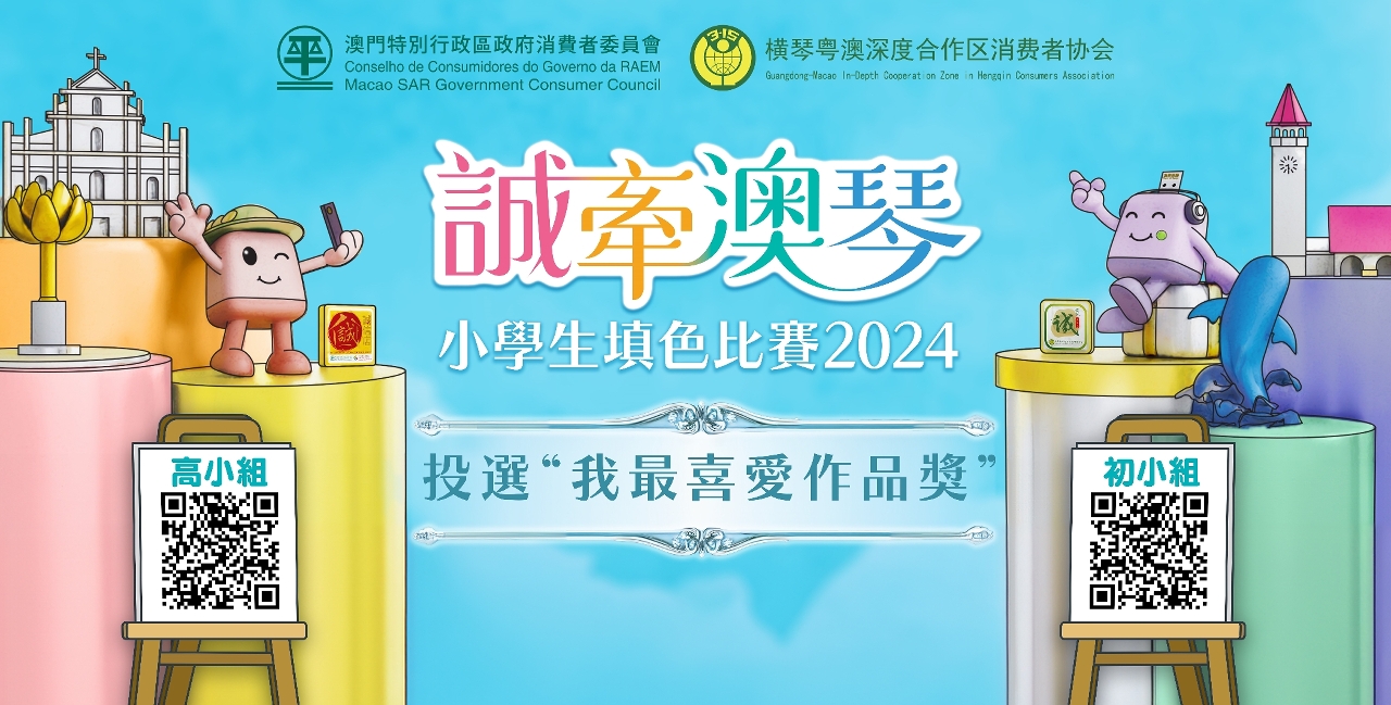 澳门特别行政区政府消费者委员会与横琴粤澳深度合作区消费者协会合办“诚牵澳琴”小学生填色比赛,澳门区收到逾一千三百份作品,全澳居民即日起至7月12日可在消委会微信官方号内投选“我最喜爱作品奖”,并有机会参加“竞猜最喜爱作品奖”抽奖活动。