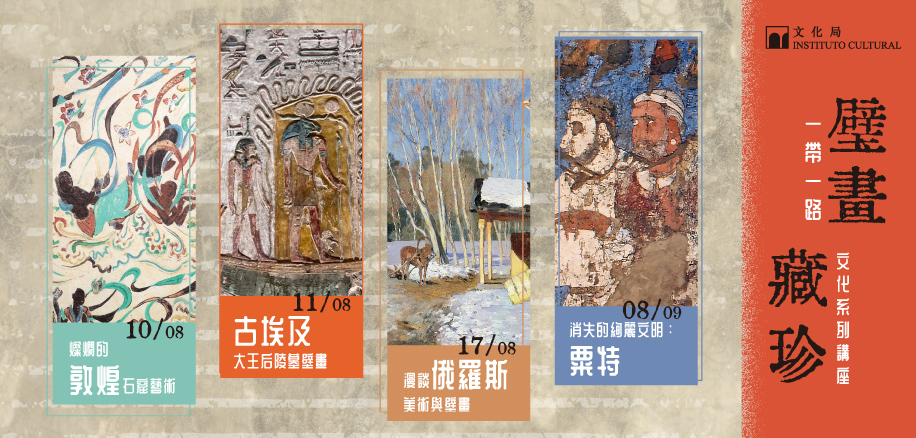 文化局将于本年8月至9月期间在澳门艺术博物馆演讲厅举办4场“壁画藏珍──一带一路文化系列讲座”,分别介绍敦煌、古埃及、俄罗斯及粟特的壁画艺术与文化风情。活动费用全免,欢迎有兴趣人士于7月4日上午10时起透过“一户通”报名参加。