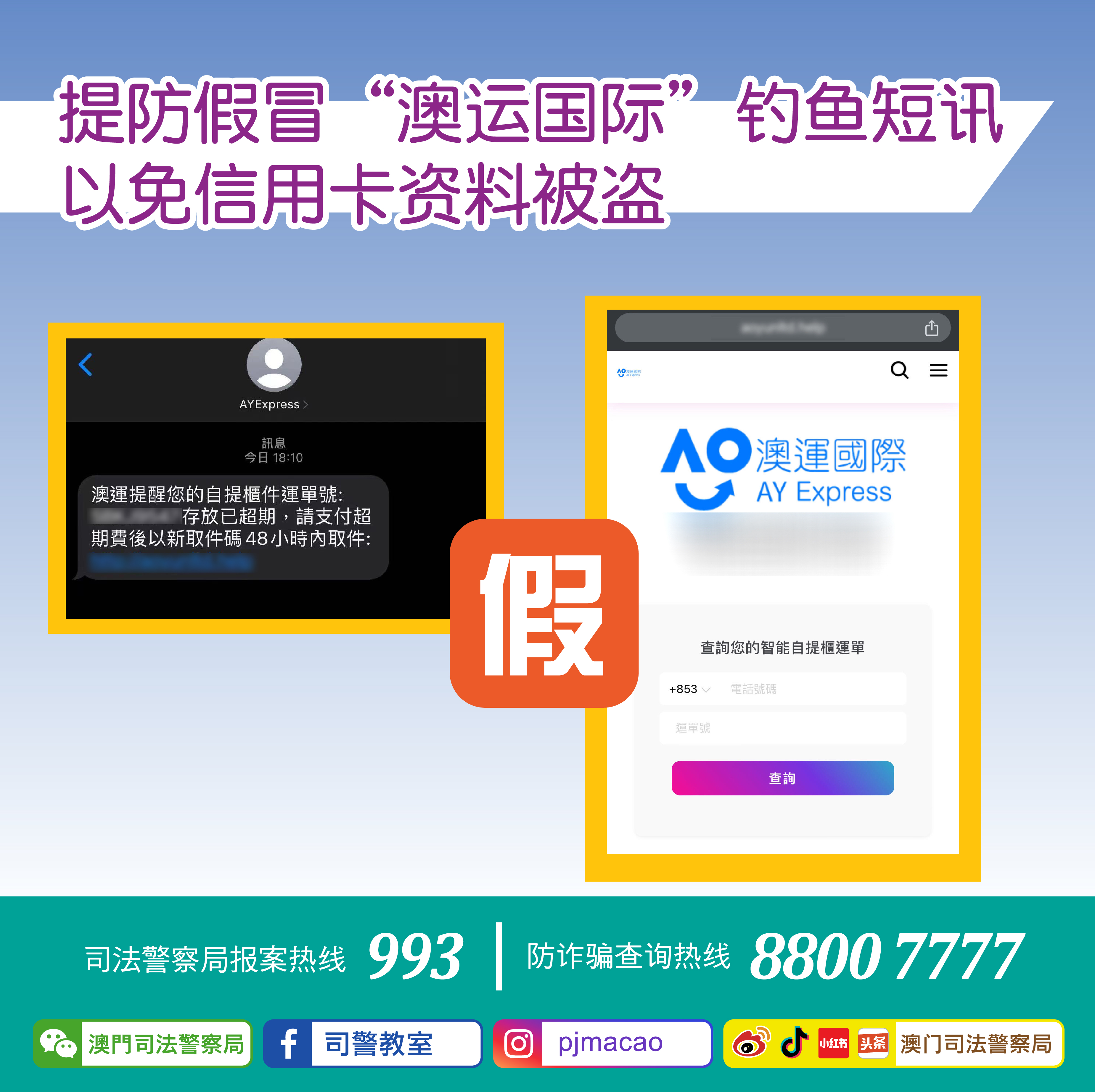 近日,司法警察局发现有骗徒随机向市民发送大量假冒物流公司“澳运国际”的钓鱼短讯,内容声称用户存放自提柜之货物已逾期,要求用户登录短讯内附带的连结并输入信用卡资料支付“逾期费”,以取得新的取件二维码,藉此套取事主的信用卡资料。
