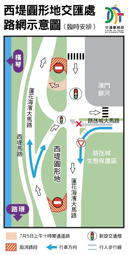 西堤圆形地交汇处部份新建道路已启用,但圆形地周边仍在进行路网重整工程,部份时段交通较为繁忙。为使行车更为畅顺,交通事务局经与治安警察局交通厅、承建单位现场协调,将调整部份交通安排,包括扩阔车道、调整交通灯配时及减少部份交通灯时相等。