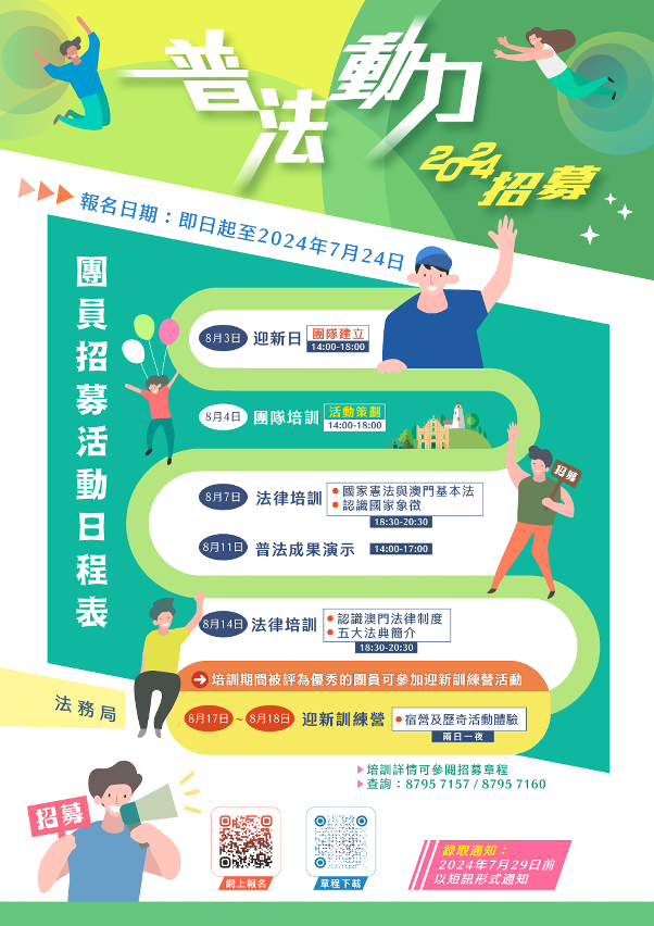 为鼓励更多青少年参与普法工作,法务局由即日起至7月24日招募新一期“普法动力”团员,正就读本澳中学中三至中六和大专院校的学生,均可报名参加。