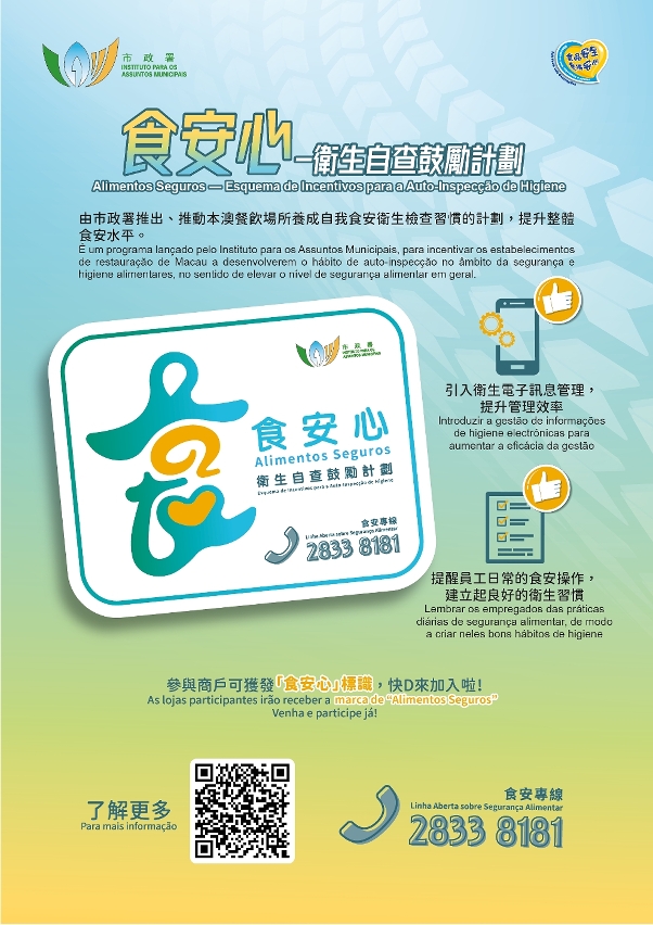 为提升食品业界的食安认知及操作水平,市政署持续提供系统性的食安培训课程供业界人士报读。七月份食品安全与环境卫生基础班及进阶班课程现正接受报名,欢迎业界踊跃报读。另外,市政署现正推出“食安心─卫生自查鼓励计划”,食品场所只要有员工完成相关食品安全课程皆可参与,藉此推动企业提升整体卫生管理水平和食品安全形象,详情可浏览食品安全资讯网内专页瞭解更多。