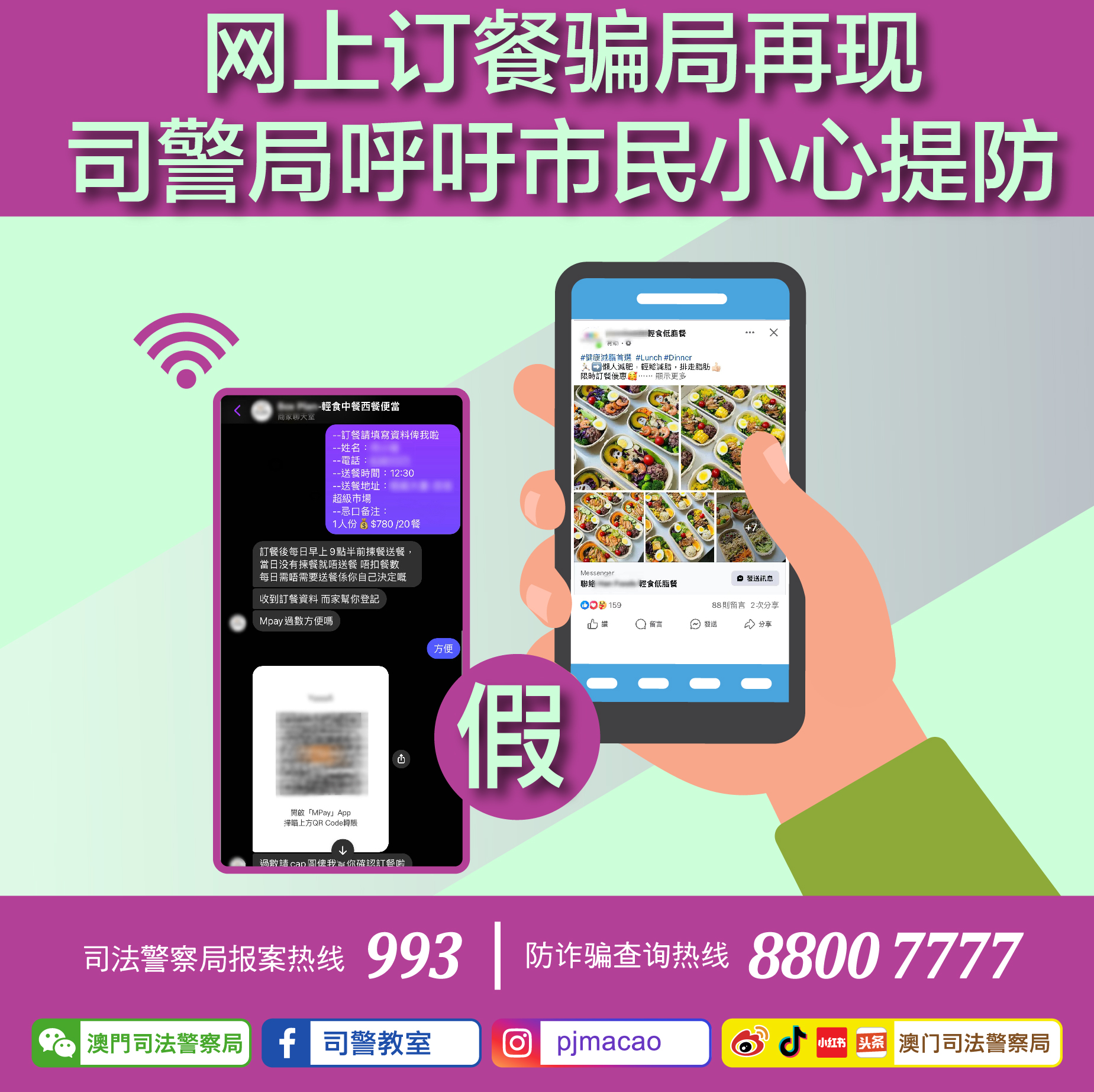 近日,司警局再度接获涉及网上订餐诈骗的举报。骗徒于网络社交平台设立“轻食中餐西餐便当”或“轻食低脂餐”订餐服务专页,以一次性订购大量餐点可获优惠价作招徕,吸引消费者订购多份餐点或分多日供应的送餐服务。然而事主向上述专页订餐并透过电子支付缴付数百至千余澳门元的全额费用后,对方并未依约送餐,其后更失去联络。多名事主合共损失逾六千澳门元。