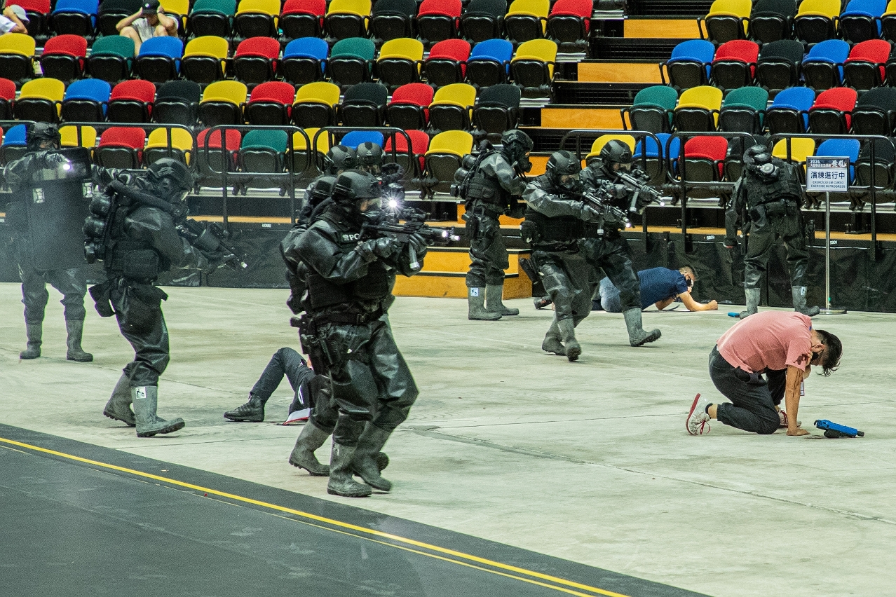 演练模拟共有7名恐怖分子,其中6名恐怖分子乘坐2辆汽车高速撞入一场大型演唱会的临时安检站,并用利刀砍伤多名人士。随后6人与赶抵的警员爆发枪战,其中1人被击中受伤,与另1同伙驾车逃离,另外4人在抛掷一枚氯气弹后,掳劫2名保安员进入场馆,并胁持馆内8000观众与警方进行谈判。期间,临时安检站内数名人士因吸入有毒气体感到不适。