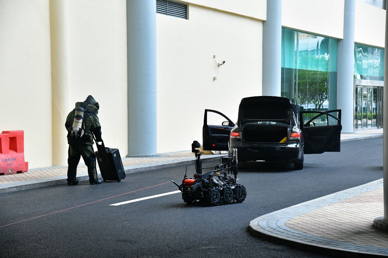 特警队爆炸品处理组对场馆内外进行搜查时,检测到恐怖分子遗下的车辆内尚有一枚土制炸弹,经评估不具生化或放射性后,由拆弹机器人进行车内排爆。