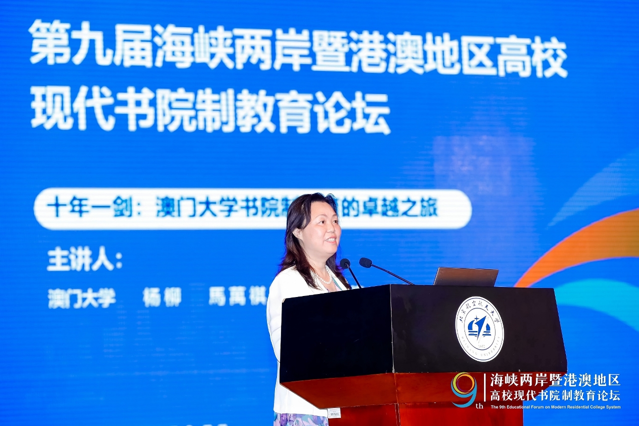 澳大马万祺罗柏心书院院长杨柳代表澳大在主论坛作“十年一剑:澳门大学住宿式书院教育的卓越之旅”的主题发言。她从澳大书院十年发展轨迹、“四位一体”全人教育模式的顶层设计、“七项胜任力”培养目标、书院组织架构及管理模式、书院五大教育举措、书院的卓越亮点等六个层面出发,全面介绍了澳大书院制教育十年来的成就,集中体现了澳大书院对学生的公民责任心、全球竞争力、知识整合能力、团队协作、服务与领导、文化参与、健康生活之七大胜任力的品格质素的培养方式和良好效果,并特别展示了澳大书院在爱国爱澳、协同育人、环境育人、跨学科融合、多语多元和风格特色等方面的独特魅力和卓越成就,获得大会专家和与会者的高度评价和肯定。