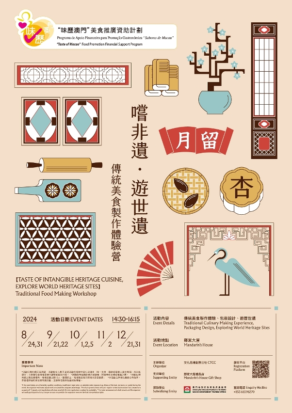 “【尝非遗‧游世遗】传统美食制作体验营”包括“传统美食制作体验”、“包装设计”及“游历世遗”一系列体验活动,丰富居民和旅客对本地美食旅游的体验,进一步提升澳门“创意城市美食之都”的美誉。活动于8月下旬至12月期间在郑家大屋共举行8场。活动费用全免,额满即止。