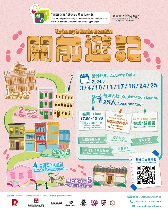 旅游局持续透过资助计划,鼓励澳门社团举办多元化旅游活动或项目,带动社区经济。受资助社团于8月份分别推出古街讲古深度游关前游记中式庙宇游历之旅澳门线及“【尝非遗游世遗】传统美食制作体验营等社区及美食活动,与居民和旅客在夏日走入世遗探索澳门各区,体验“旅游+”乐趣,共度缤纷的夏日时光。