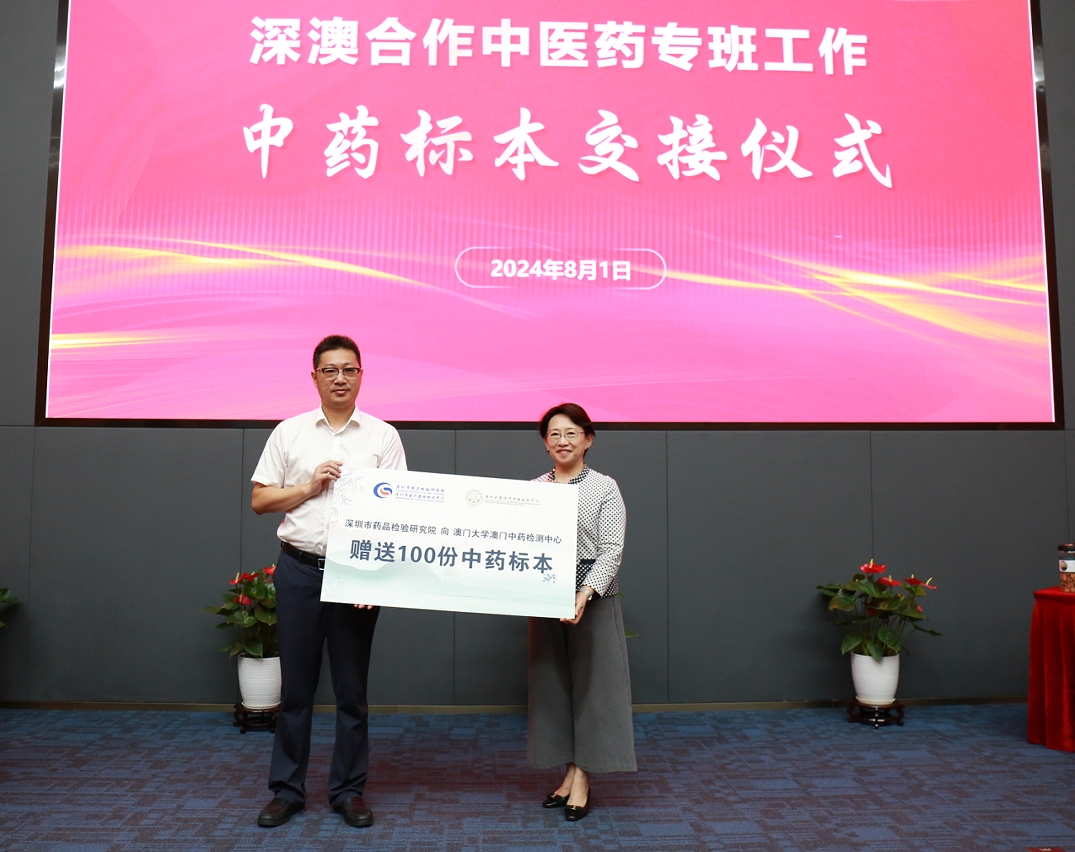 为落实 “澳门大学与深圳市药品检验研究院战略合作框架协议”,支持澳大澳门中药检测中心的建设和发展,深圳市药品检验研究院向中心捐赠100份中药标本,进一步深化深澳两地在中医药产业的合作,推动澳门中药检测的发展。