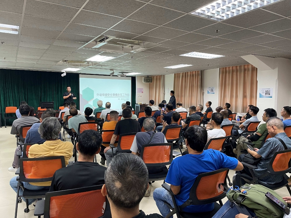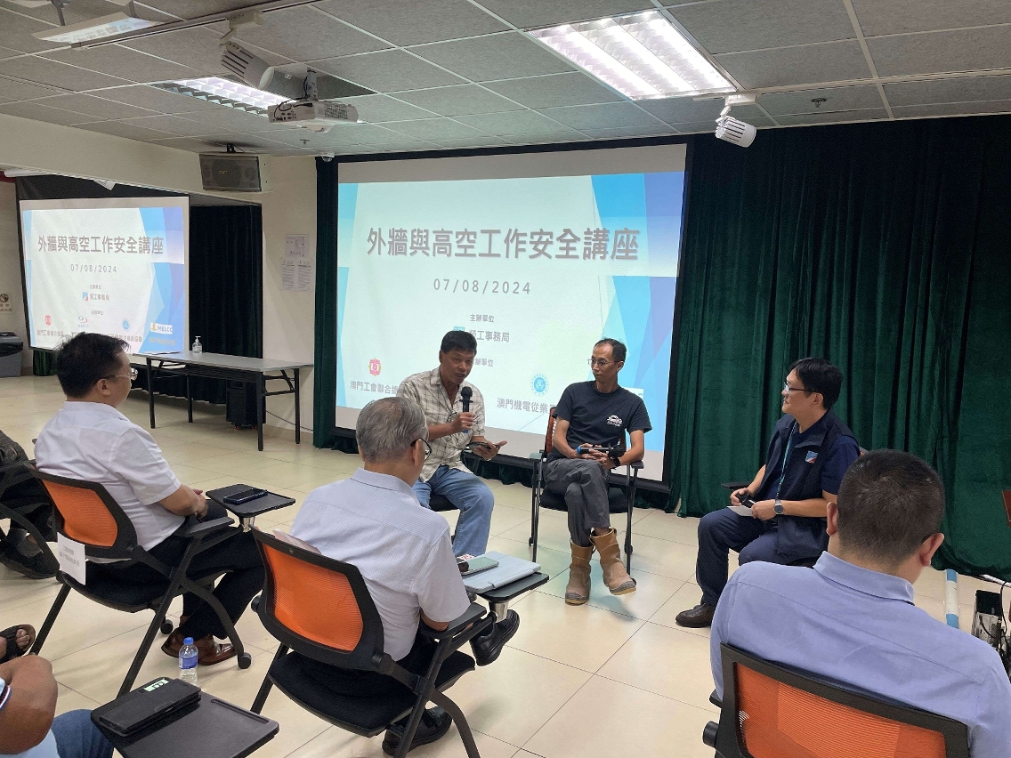 踏入炎夏季节,本澳大厦和屋苑会进行较多的外墙工作,特别是外墙装修、维修和装拆冷气等高危工序,为提醒业界做好外墙与高空工作的职安健,劳工事务局联同澳门工会联合总会、澳门空调制冷商会、澳门机电从业员协会和电业商会于8月7日合办「外墙与高空工作安全讲座」,让机电业界人士、空调安装与维修保养承办商,以至相关从业人员了解更多外墙工作的职安健讯息,并积极拓展与业界的合作与交流,共同推动和提升澳门机电业界的职安健文化。