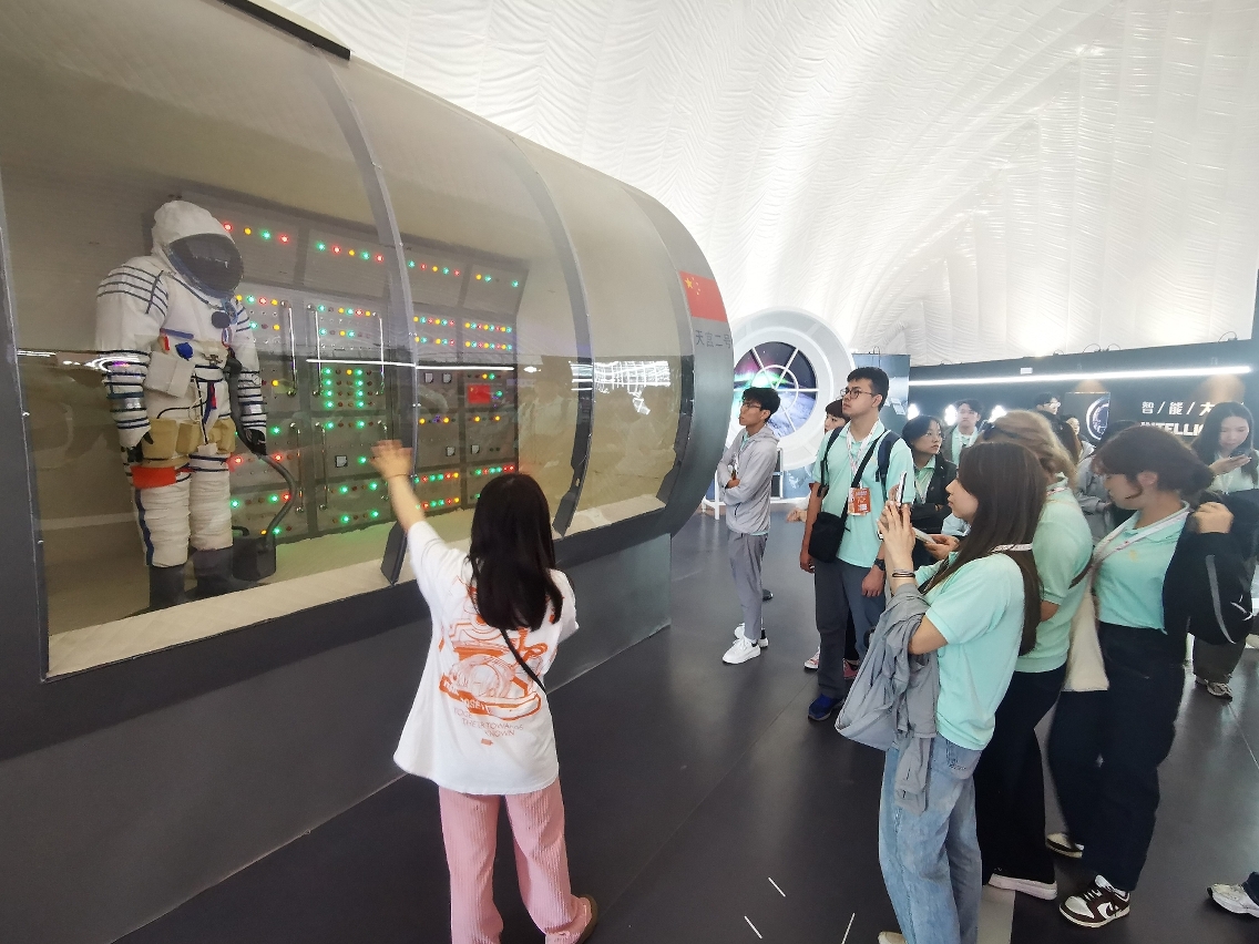 交流团另一重点行程是到“金昌一号”火星基地进行沉浸式体验,领略通过火星生存场景模拟、实体建筑仿制、科幻造景等手段形成完整的沉浸式航天体验设施和科普、研学体系,从多角度了解多元新业态的火星生活场景。团员纷纷对基地的展陈表现浓厚兴趣。在体验过程中,学生还饶有兴致穿起航天服拍照留念。