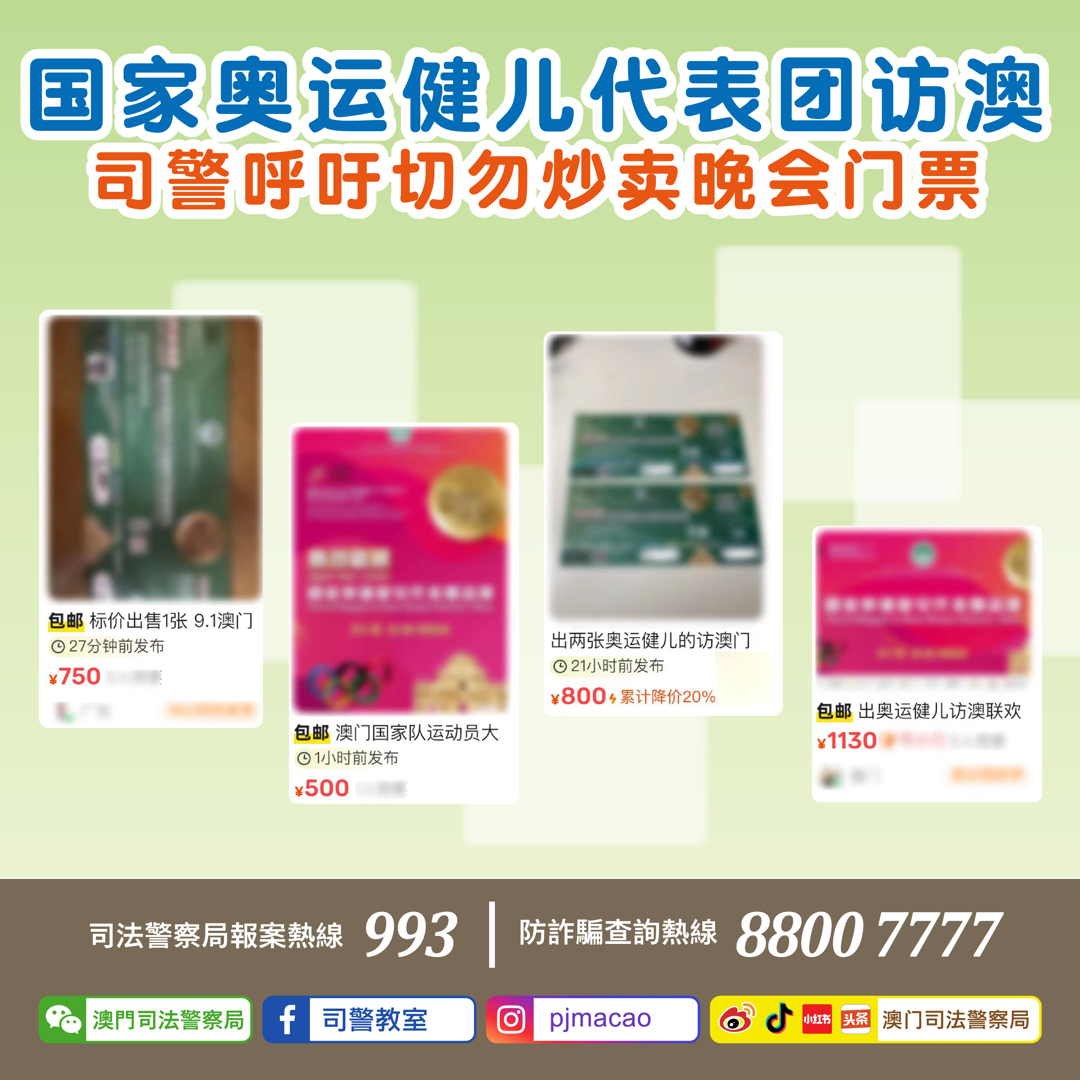 近日,司法警察局发现有人于网络社交平台炒卖“我们的骄傲—国家奥运健儿代表团澳门联欢晚会”门票。