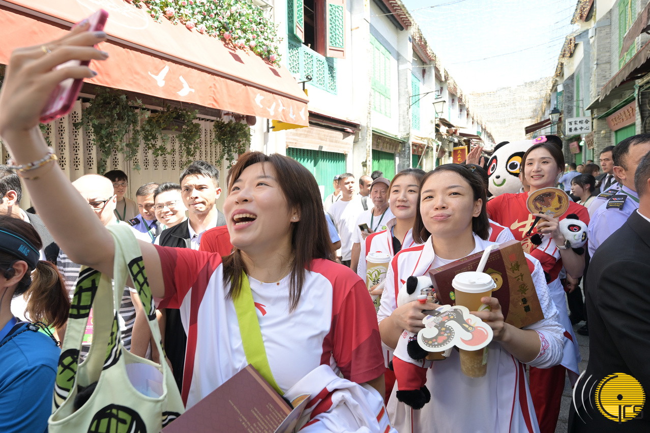 随后,代表团成员分成三队,于下午2时30分分别参观妈阁塘片区、福隆新街步行区及大炮台花园。期间参观了各景点的特色设施、展览,并与市民亲切互动交流,现场吸引大批居民、游客驻足,一同感受国家奥运健儿访澳的热烈气氛。