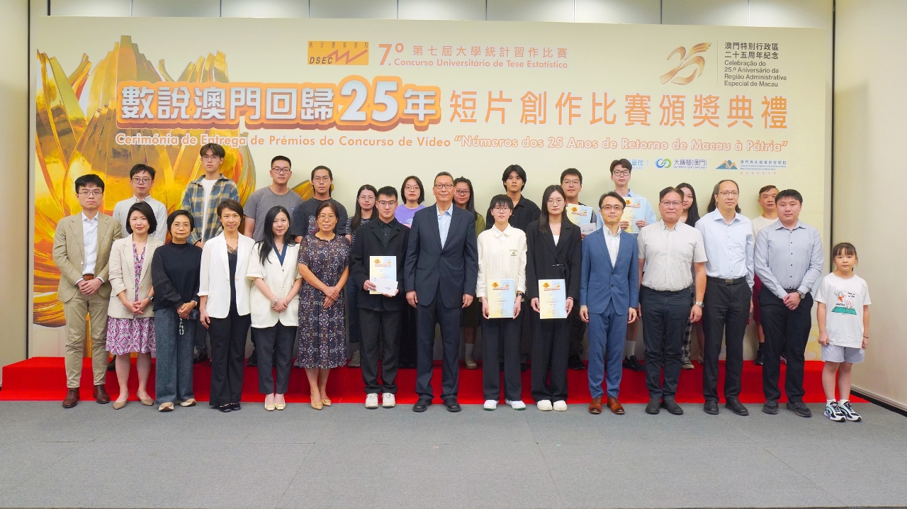 为庆祝澳门回归祖国25周年,并持续推广官方统计数据及知识的普及,统计暨普查局举办了“数说澳门回归25年”短片创作比赛,鼓励学生透过统计数据展现本澳自回归以来在人口、社会或经济等方面的变迁与发展。比赛颁奖典礼已于上周六(5日)假澳门青年创业孵化中心举行,颁发一等、二等、三等奖、优异奖、最具创意奖及网上人气奖等18个奖项。