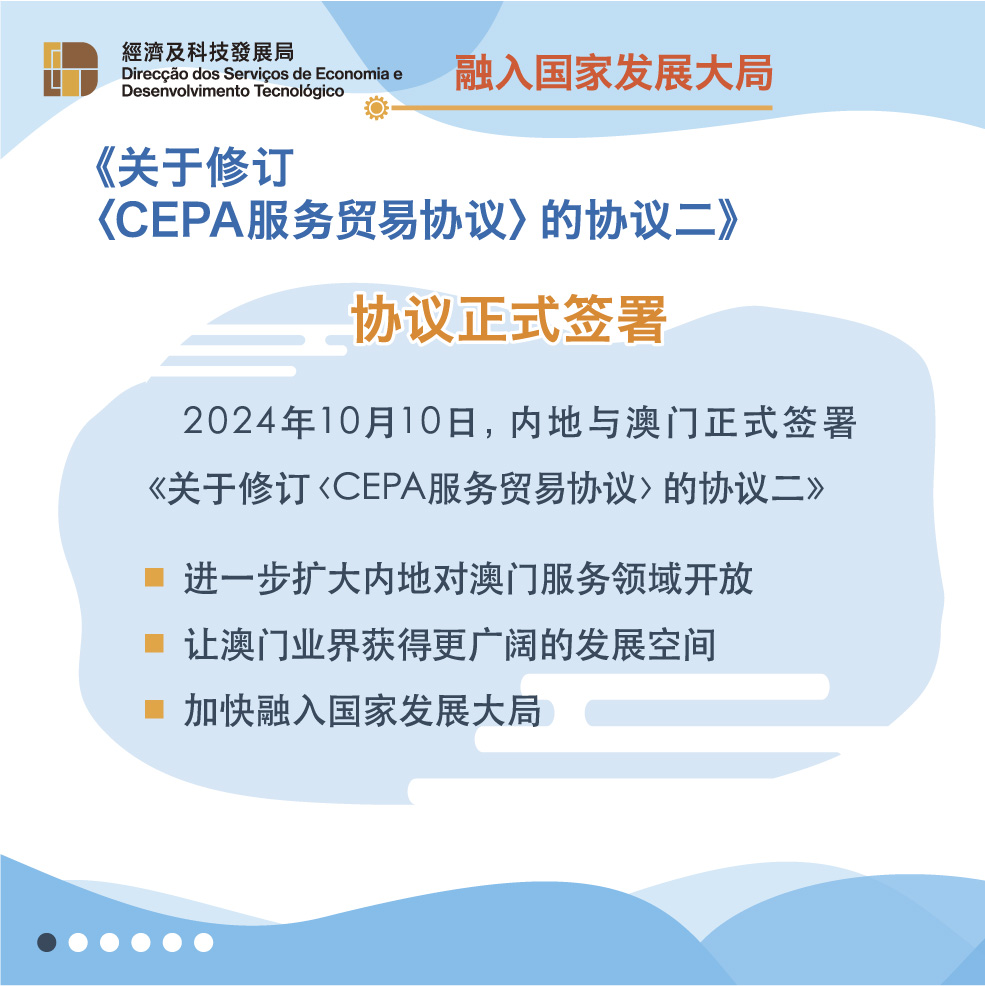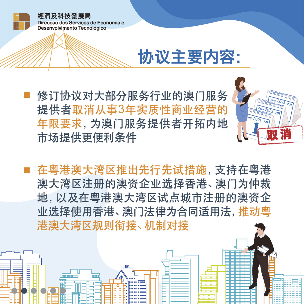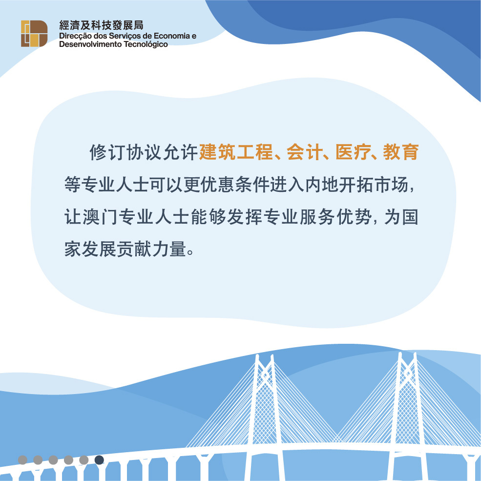 此外,《修订协议二》进一步提升对澳门专业服务的开放水平,允许建筑工程、会计、医疗、教育等专业人士可以更优惠条件进入内地市场,让澳门服务提供者能够发挥优势,为国家发展贡献力量。