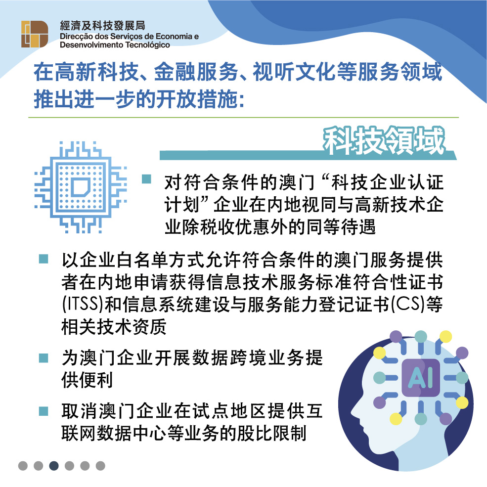 《修订协议二》增加高新科技、金融服务、视听文化等服务领域的开放措施,支持澳门“1+4”适度多元发展策略,为澳门经济适度多元发展创造新空间。科技领域方面,对符合条件的澳门“科技企业认证计划”企业在内地视同与高新技术企业除税收优惠外的同等待遇、允许符合条件的澳门服务提供者在内地获得相关技术资质认可、取消澳门企业在试点地区提供互联网数据中心等业务的股比限制等。金融服务领域方面,取消澳门银行5年实质性商业经营的年限要求及境外金融机构入股保险公司年末总资产的限制等。视听文化领域方面,允许澳门企业投资电影制作、与内地合拍电视剧可视为国产电视剧播出和发行等。