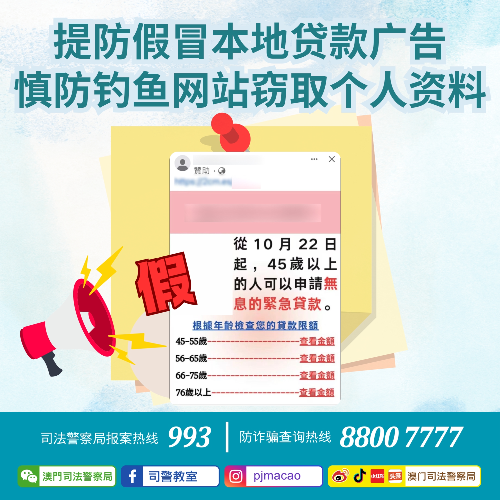 今日(10月26日),司法警察局于网上社交平台发现有人发布不实贷款广告,广告内容讹称澳门特区政府将向45岁以上人士提供“无息的紧急贷款”,要求有意者按相应年龄层点击广告附带之连结进行申请。上述连结点击后将会跳转到另一个设置了多个来历不明贷款广告页面,有关网页不断变动,相信最终会转接到钓鱼网站。