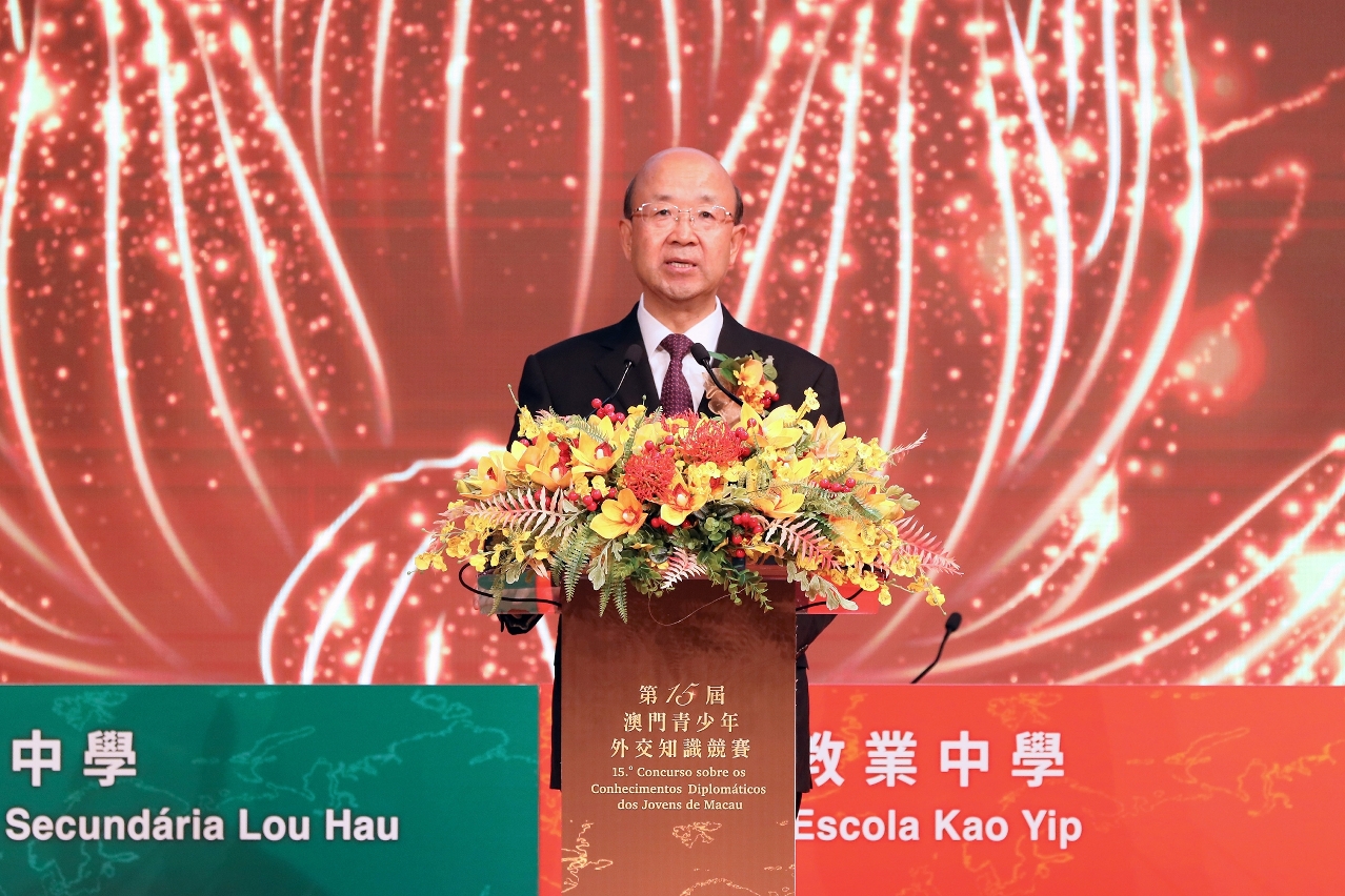 颁奖礼上,外交公署特派员刘显法致辞时表示,澳门青少年外交知识竞赛已走过15个年头,澳门青年外交素养和国际视野不断强化提升,一直以来,外交公署持续深入践行外交为民、外交惠澳理念,坚定维护国家安全和特区稳定,积极支持特区政府扩大对外交流合作,全力保障澳门同胞海外权益。刘显法特派员还勉励澳门青年要增强家国情怀,把人生理想与国家命运紧紧相连,增强奋斗情怀,用顽强拼搏精神点亮青春梦想,增强天下情怀,做人类命运共同体理念的坚定践行者,树立自信自立开展对外交往的志气与底气,勇于开拓、勇攀高峰,共创祖国和澳门更加美好未来,为澳门经济适度多元发展和粤港澳大湾区、横琴粤澳深合区建设贡献智慧和力量。