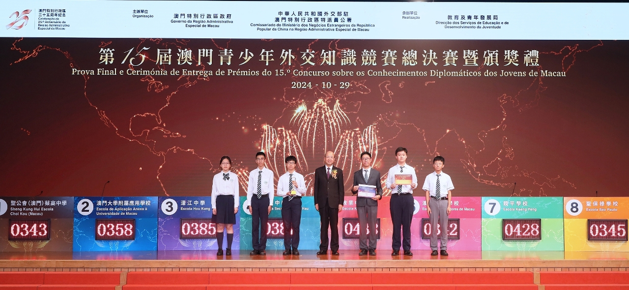 适逢中华人民共和国成立75周年、澳门特别行政区成立25周年,由澳门特别行政区政府与中华人民共和国外交部驻澳门特别行政区特派员公署主办、教育及青年发展局承办的第15届澳门青少年外交知识竞赛总决赛暨颁奖礼于10月29日成功举行。竞赛综合考验参赛学生对习近平外交思想、中国特色大国外交、涉澳外交、外交史、外交常识、时政热点等的掌握和运用,得到特区社会各界广泛支持。本届参与的学校共37所,学生人数达 9,000人,由推广赛、初赛到脱颖而出进入总决赛的8支队伍,经过一轮紧张的外交知识较量,最终获得冠军的是教业中学,亚军、季军和殿军的队伍分别是镜平学校、劳校中学、濠江中学,获优异奖的是:澳门大学附属应用学校、圣保禄学校、圣公会(澳门)蔡高中学、澳门坊众学校。