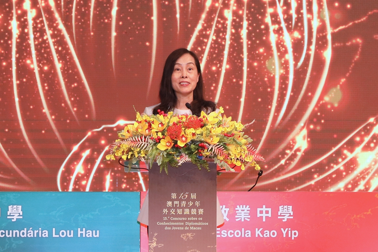 社会文化司司长欧阳瑜致辞时勉励同学们,必须不断学习,运用正确的历史观来观察世界,弄清楚在世界格局演变中自身的地位和作用,才能坚定地理解与世界各国共同建设、维护、发展和平的路向,才能在推动构建人类命运共同体中贡献自己的力量;同时寄望广大青年成为“一国两制”的接班人、“人类命运共同体”的参与者、建设者、传播者和贡献者,为中华民族伟大复兴发挥澳门青年力量。欧阳瑜司长亦表示,为了不断加强澳门青年学生对国家外交事务的正确认知,提高其分析能力和解决问题的能力,特区政府一直以来持续与外交公署紧密合作,在各教育团体、学校及高校等大力支持下,成功举办多项包括“澳门青少年外交知识竞赛”、“澳门高校外交演讲比赛”、“青年外交官进校园活动”等品牌活动,让青年学生能清晰认识中国在国际社会中的重要角色和伟大贡献,深刻掌握“中国特色的大国外交思想”的重要意义,并为此而感到自豪。