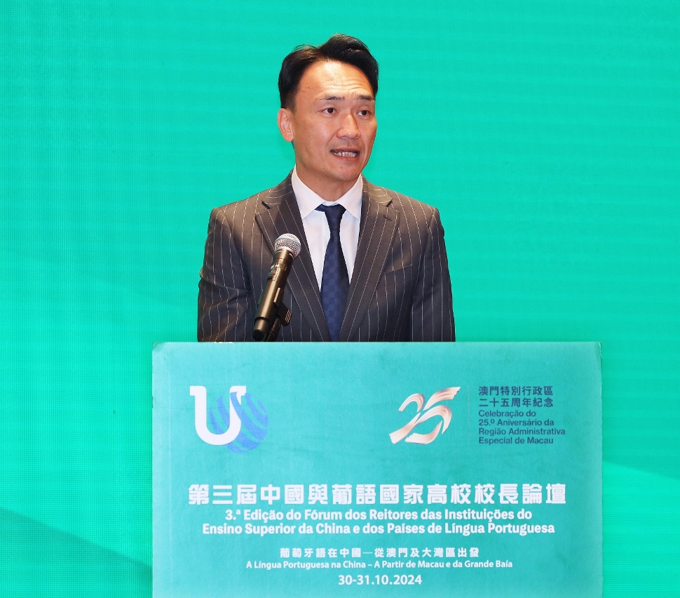 龚志明局长致辞时表示国家赋予澳门作为“中国与葡语国家商贸合作服务平台”的发展定位,当中承载着促进中国与葡语国家,在经贸、科研、教育及文化等多领域互利共赢和共同发展的重大使命,同时进一步彰显澳门背靠祖国、联通世界的独特地位。期望澳门高校与内地及葡语国家高等教育机构持续拓展长久以来所建立的良好关系和合作,致力开拓多领域中葡人才培养的新路径,以及中葡教育及科研合作的新方向。