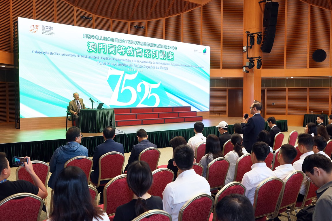 为庆祝中华人民共和国成立75周年和澳门特别行政区成立25周年,教育及青年发展局于10月8日假澳门科学馆会议中心会议厅举行澳门高等教育系列讲座。是次讲座为澳门高等教育界“双庆月”重点活动之一,以“跨学科教育与人才培养”为题,并邀请澳门大学教育学院STEM教育讲座教授、教育测验与评核研究中心主任柳秀峰担任主讲嘉宾,分享高等教育培养跨学科科技创新人才的经验与成果,藉此加强澳门高等院校人员对跨学科教育的了解。教青局副局长丁少雄、澳门高校领导及教青局主管、澳门高校行政管理人员、教职员及学生等约200人出席。